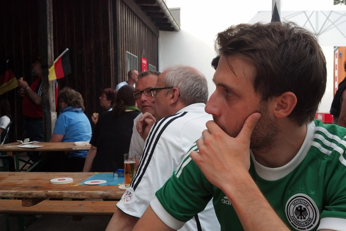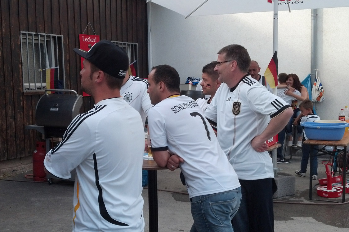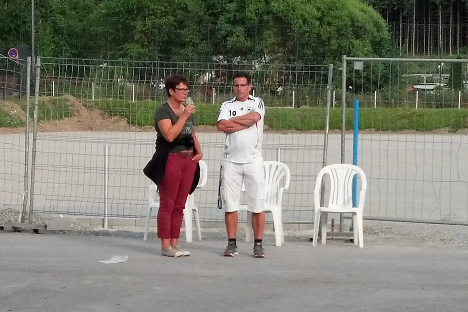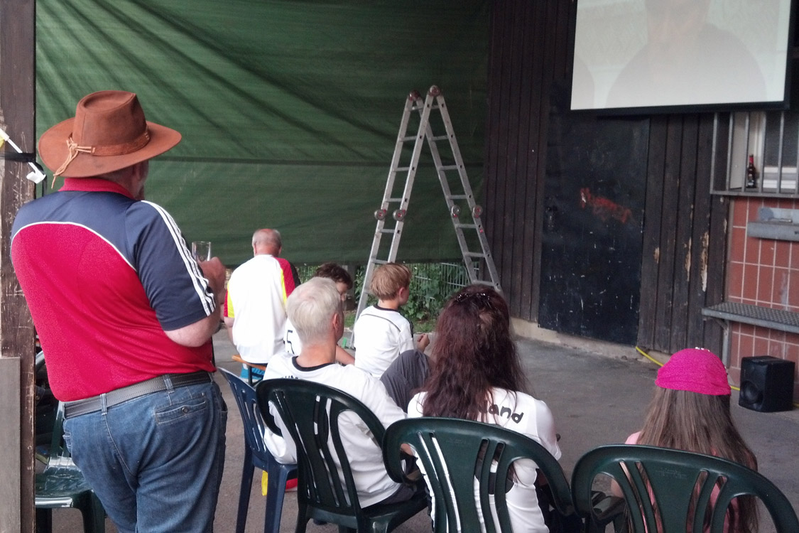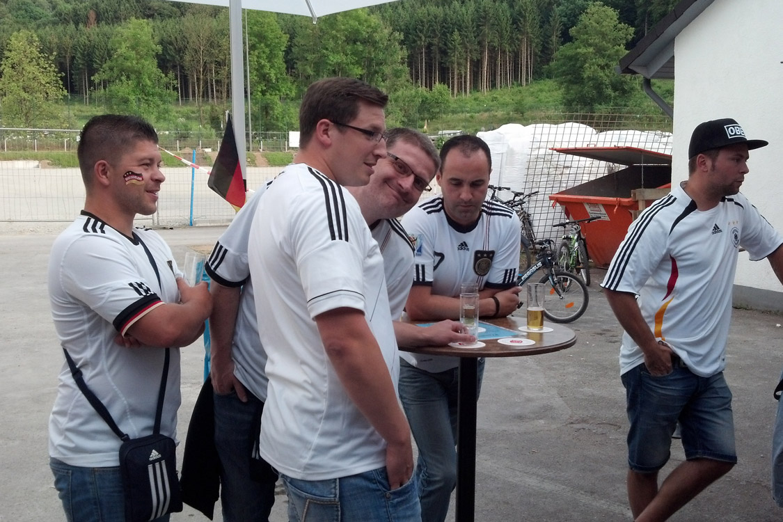 Rotzblag Jogi gegen Ziehpapa Klinsi - das war das Duell, das die zahlreichen Gäste des Public Viewings am Bielsteiner Sportplatz bestaunen durften. Das Vater-Sohn-Duell endete mit einem Sieg für den Sohnemann, sodass zumindest die Deutschen zufrieden nach Hause gehen konnten (Fotos: Benjamin Gries).