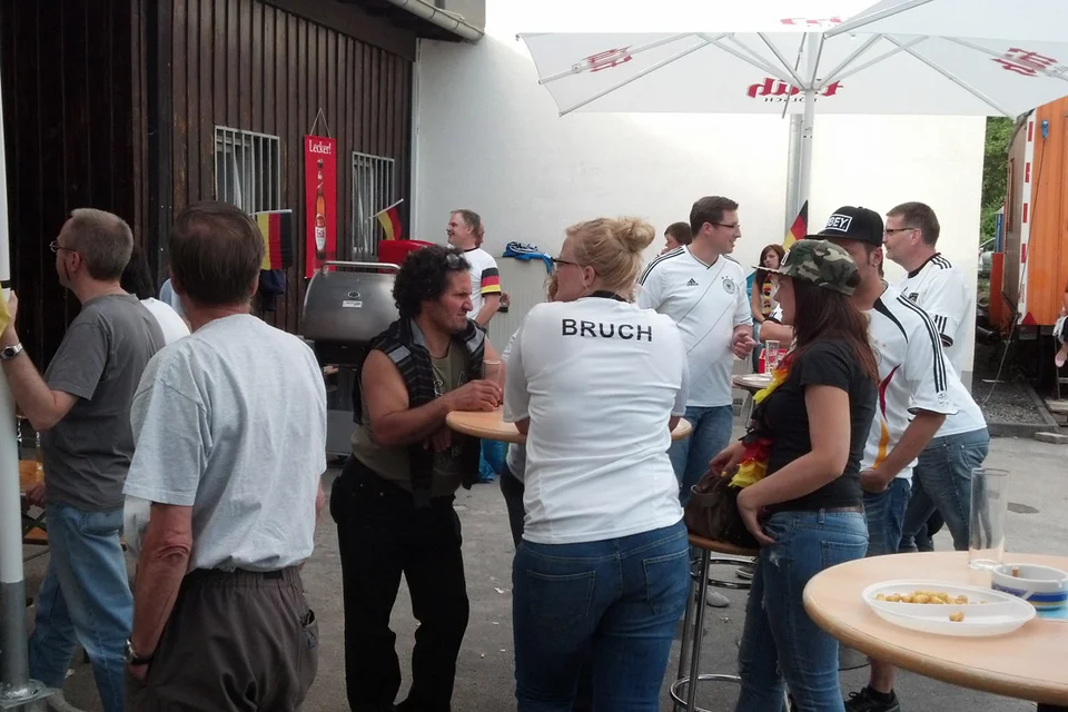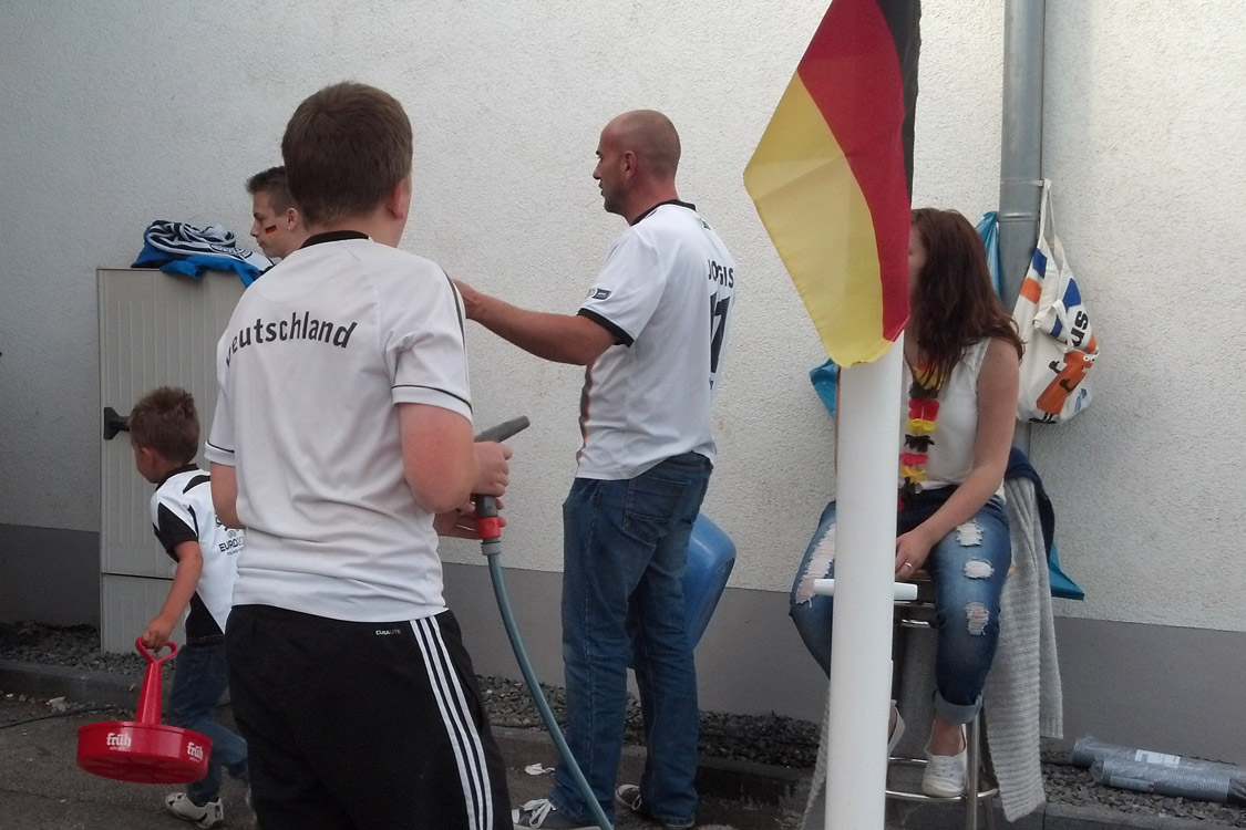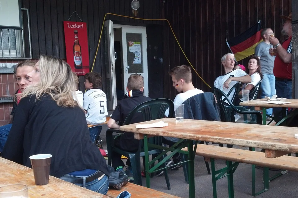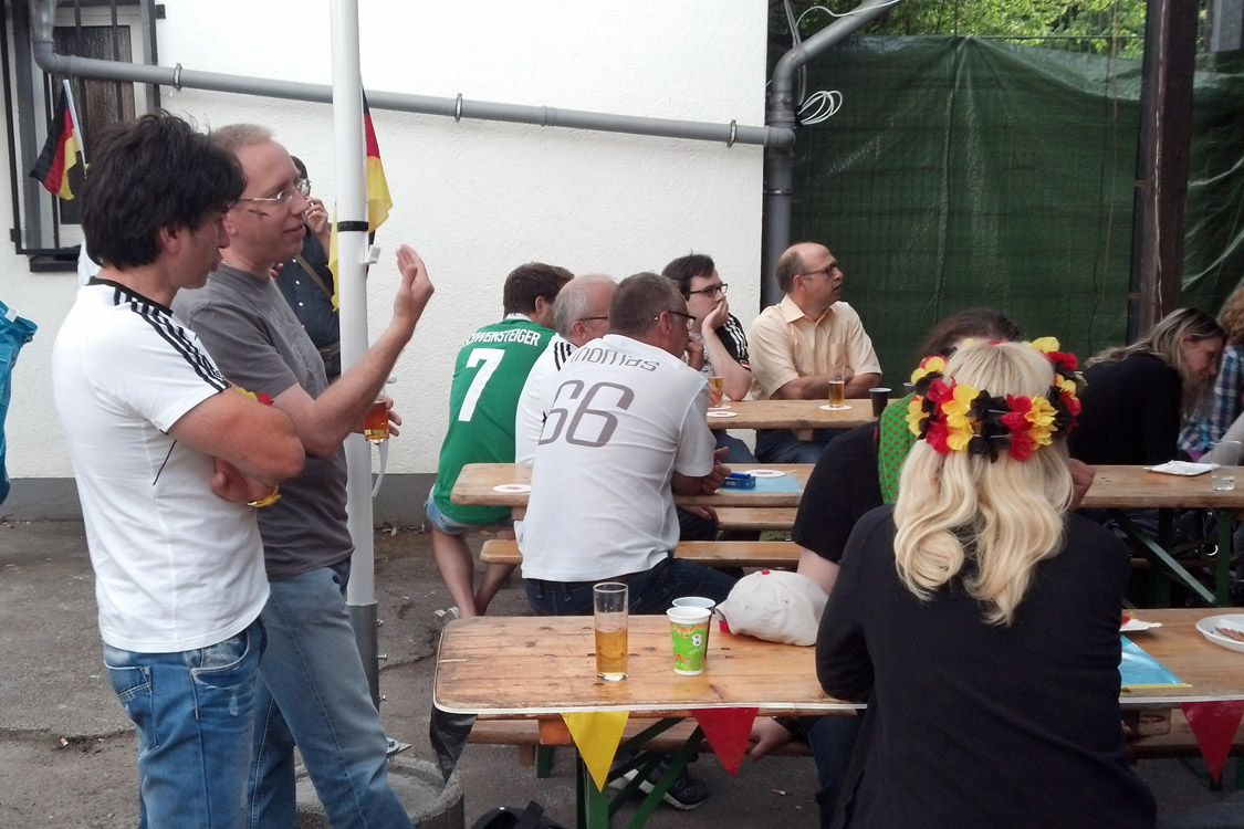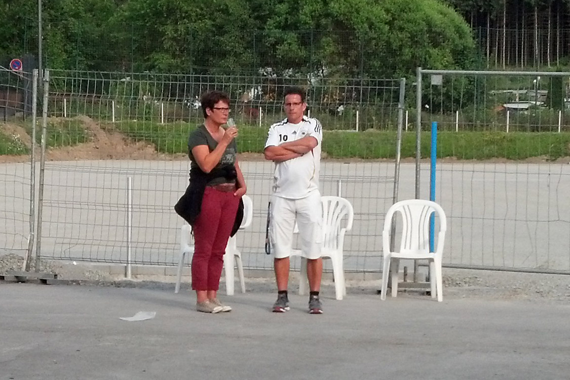 Rotzblag Jogi gegen Ziehpapa Klinsi - das war das Duell, das die zahlreichen Gäste des Public Viewings am Bielsteiner Sportplatz bestaunen durften. Das Vater-Sohn-Duell endete mit einem Sieg für den Sohnemann, sodass zumindest die Deutschen zufrieden nach Hause gehen konnten (Fotos: Benjamin Gries).