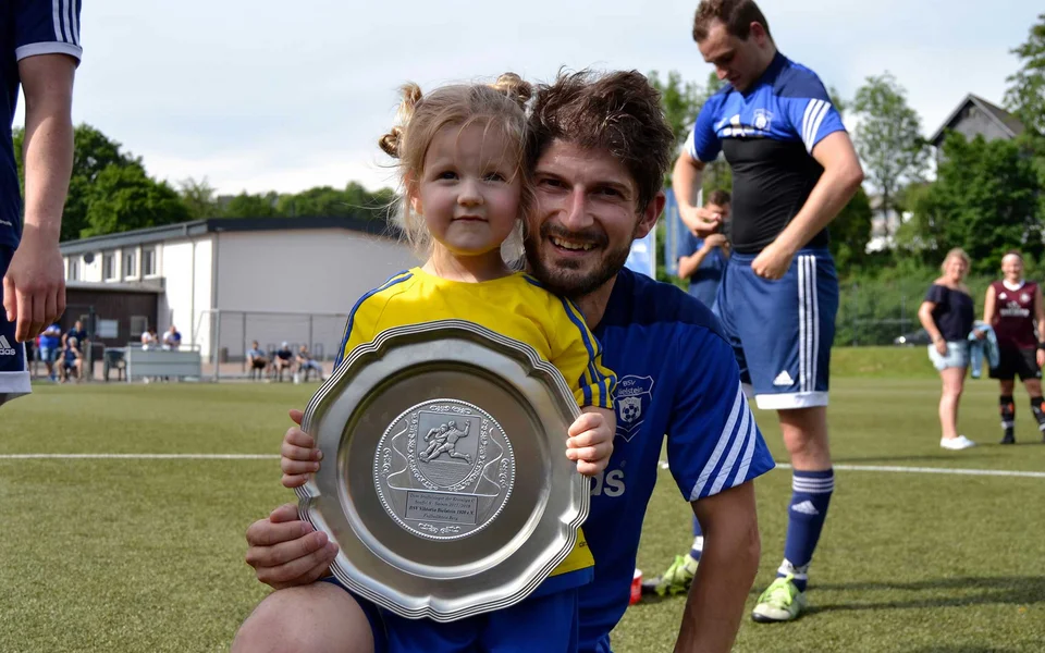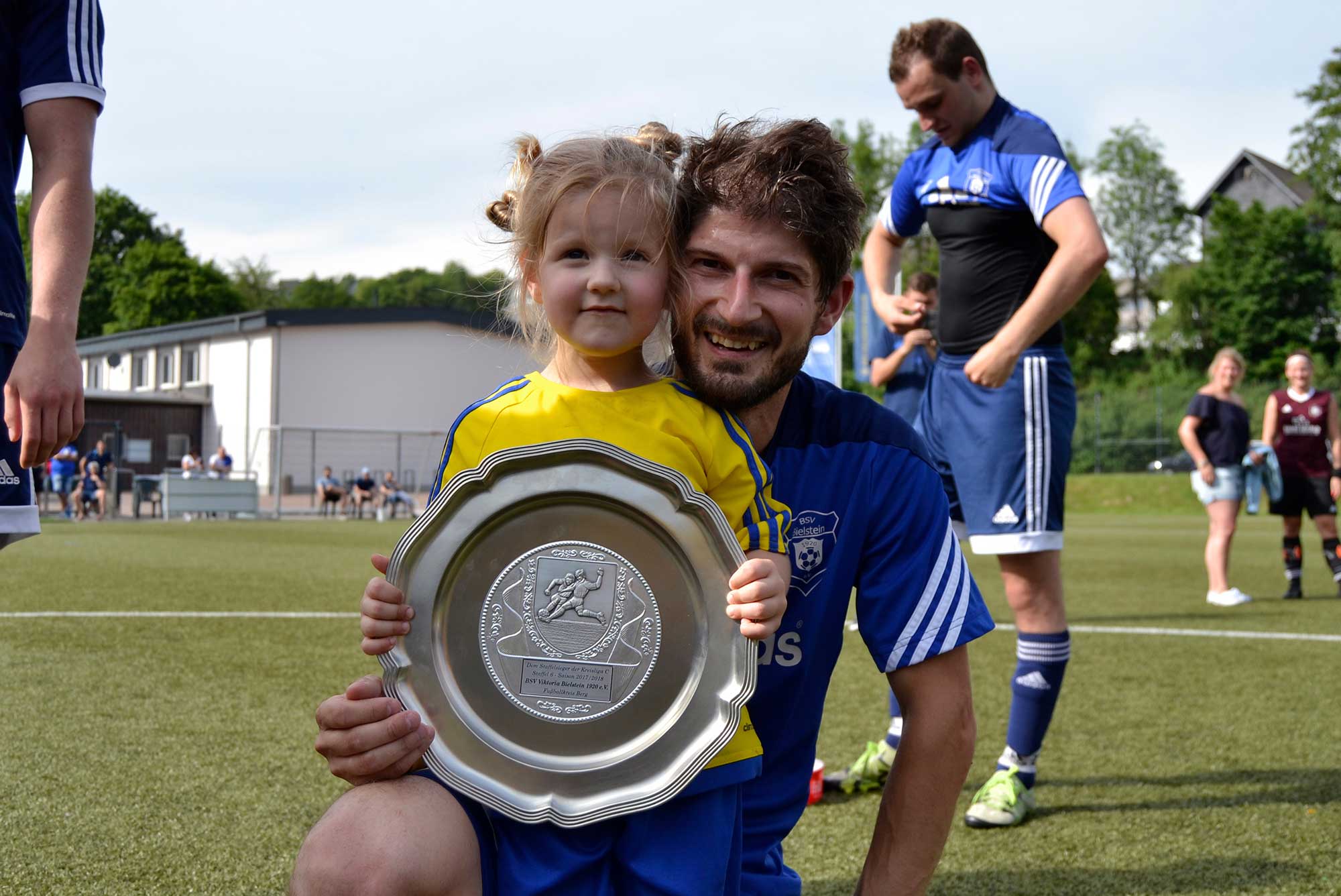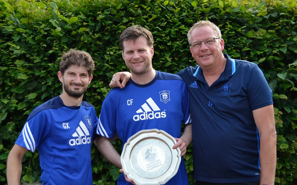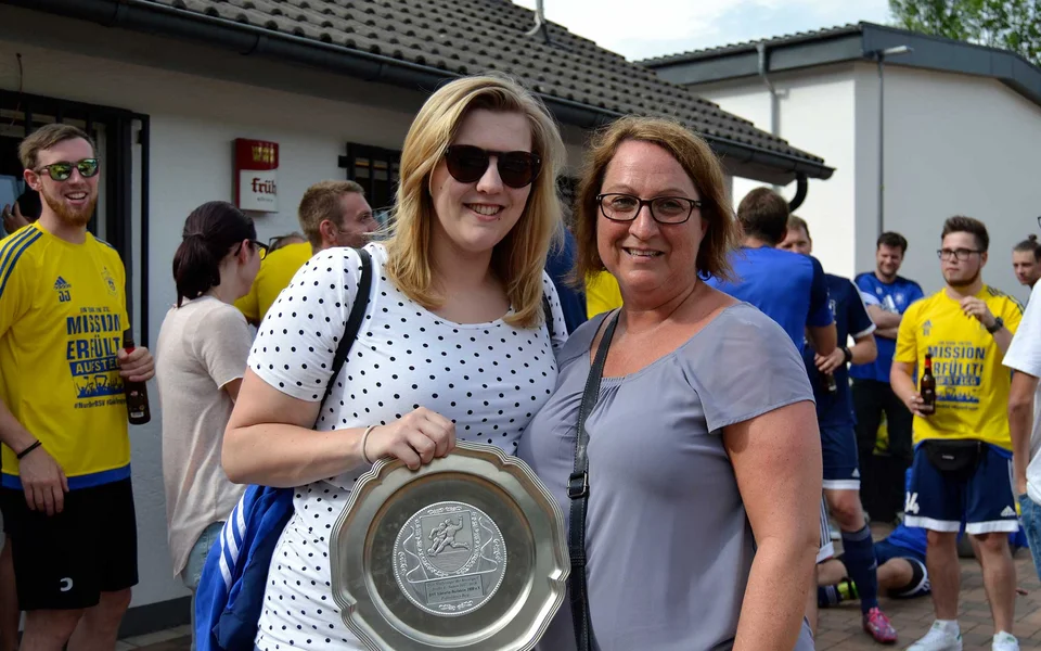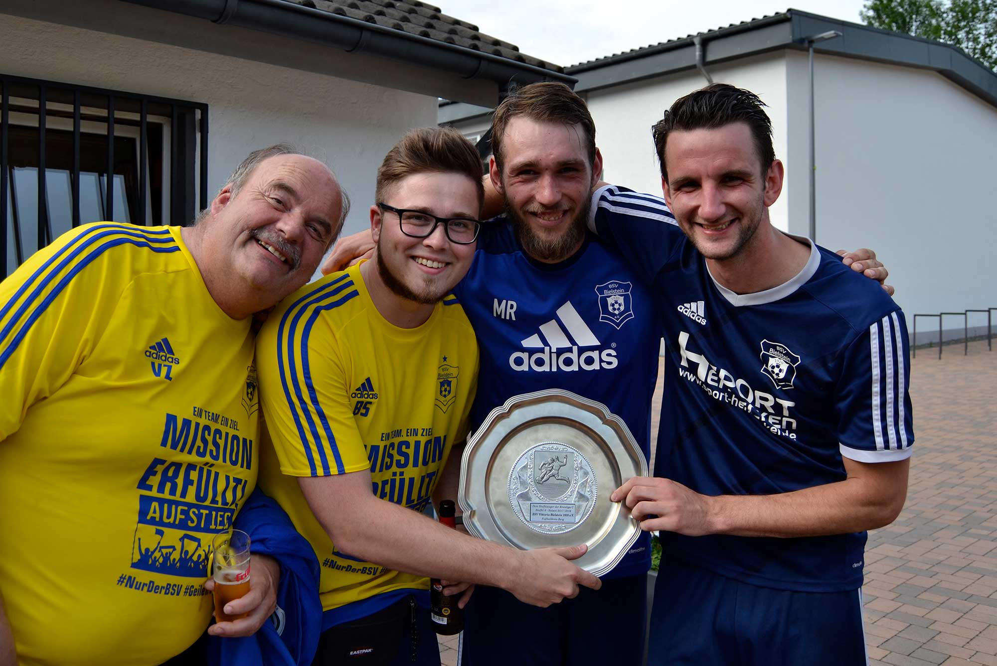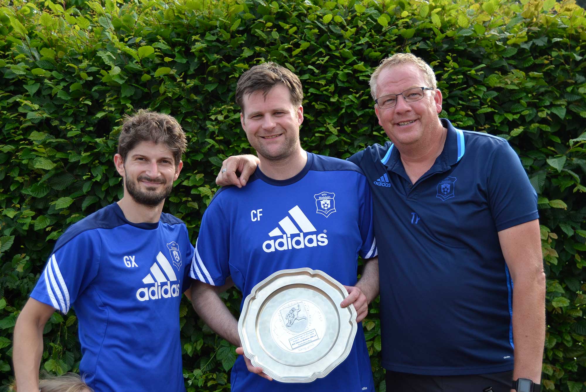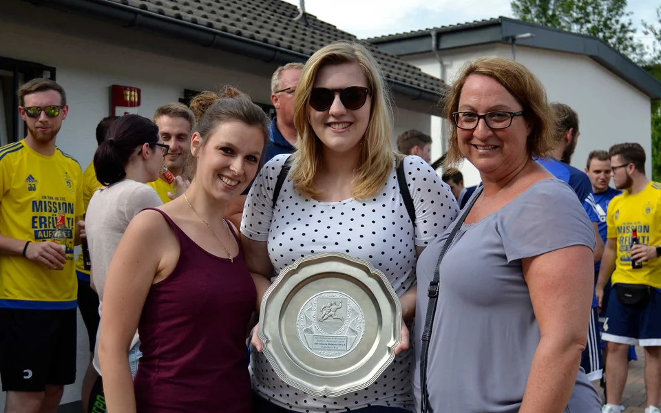 Nach langer Wartezeit bekam unsere Erste Herren am Sonntag, den 27. Mai 2018, endlich die Schale überreicht. Stellvertretend für die Mannschaft nahm der langjährige ehemalige Kapitän Ronnie Schmidt die Schale aus den Händen von Sabrina Räbsch entgegen.