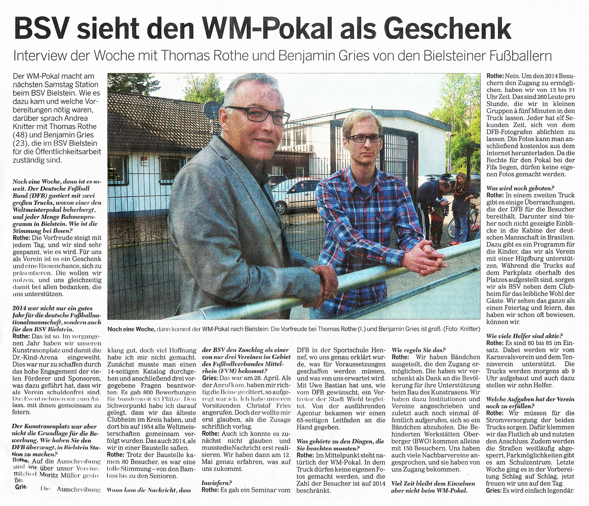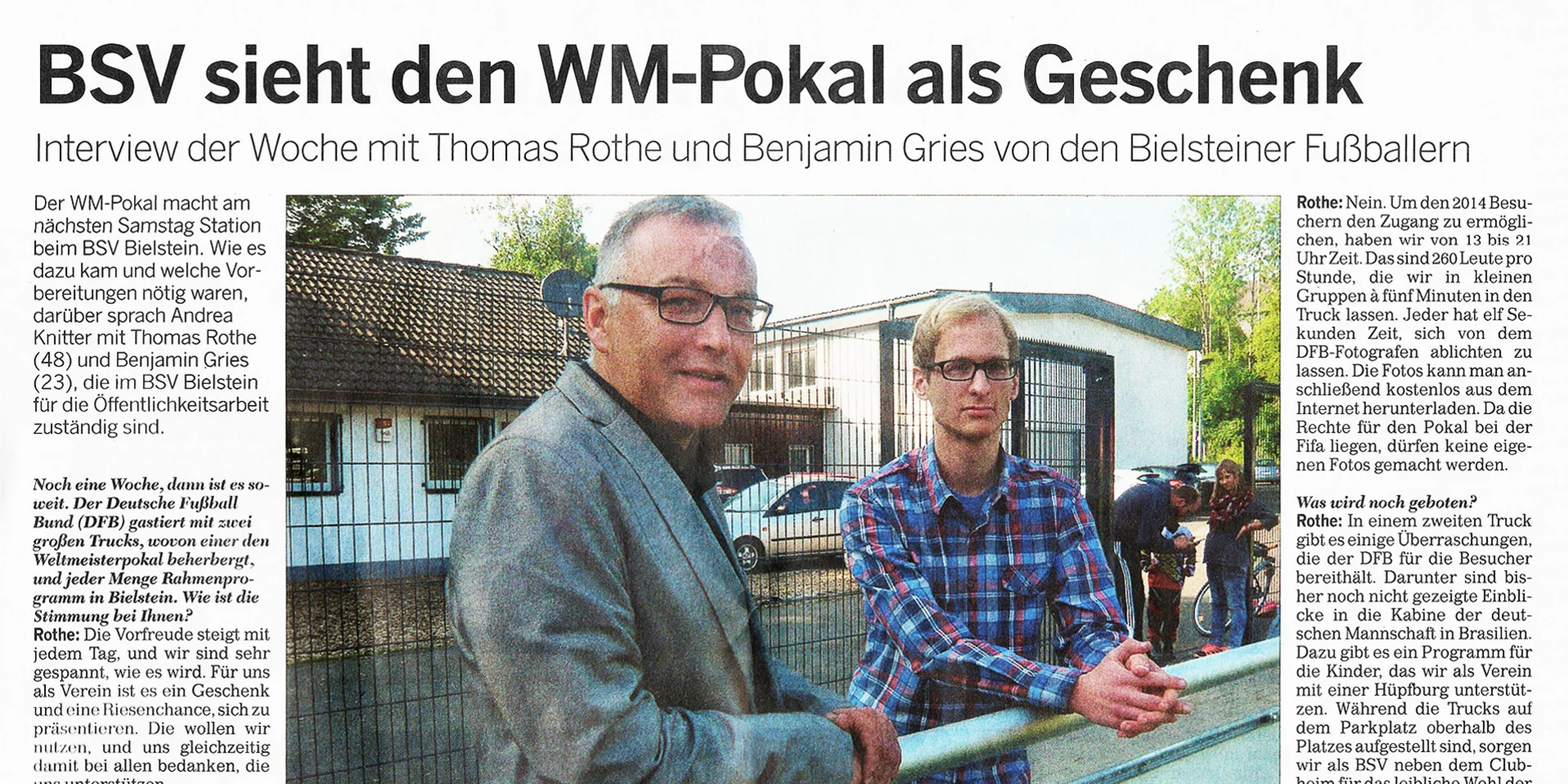 Der BSV Bielstein ist wieder einmal in der Presse vertreten: unter der Überschrift „BSV sieht den WM-Pokal als Geschenk” berichtet die Oberbergische Volkszeitung über die Teilnahme unseres Vereins an der Ehrenrunde. Wie es dazu kam und welche Vorbereitungen nötig waren, darüber sprach Andrea Knitter mit Thomas Rothe (48) und Benjamin Gries (23), die im BSV Bielstein für die Öffentlichkeitsarbeit zuständig sind.