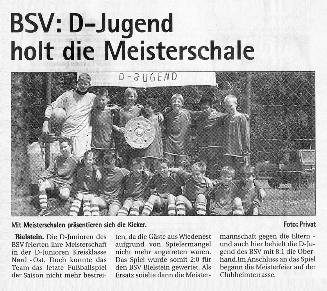 Der BSV Bielstein ist wieder einmal in der Presse vertreten: unter der Überschrift „D-Jugend holt die Meisterschaft” berichtet die Oberbergische Volkszeitung über die Meisterschaft unserer U13 im Jahre 2008.