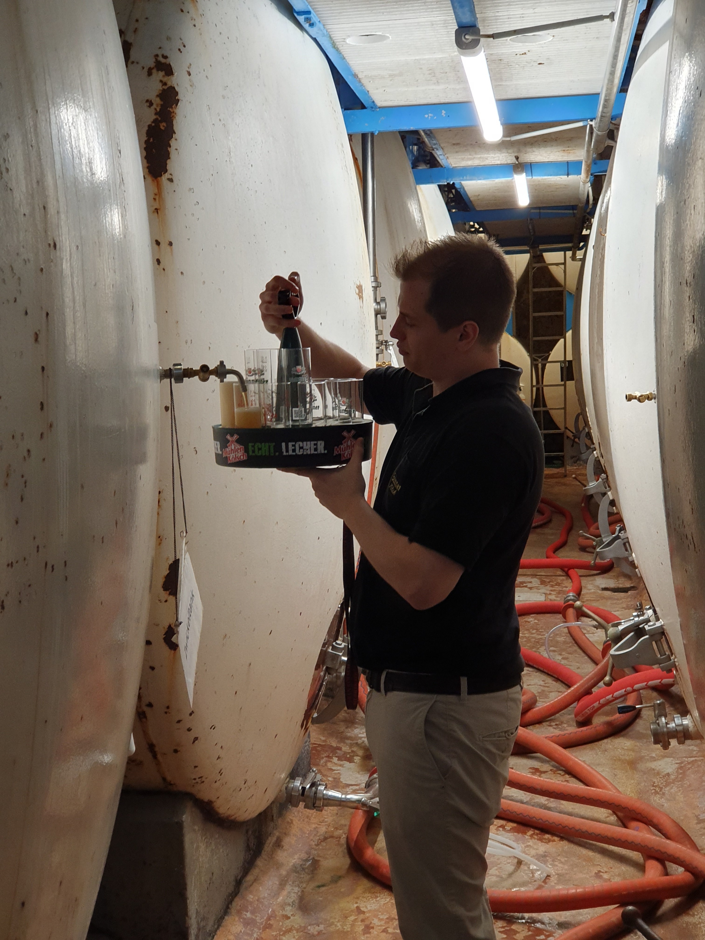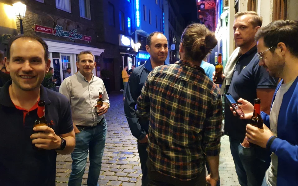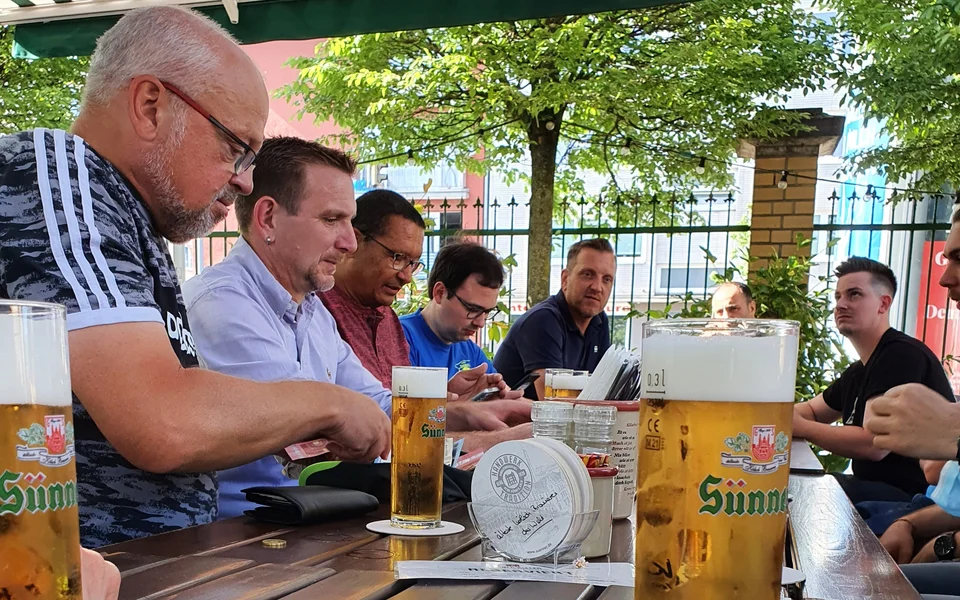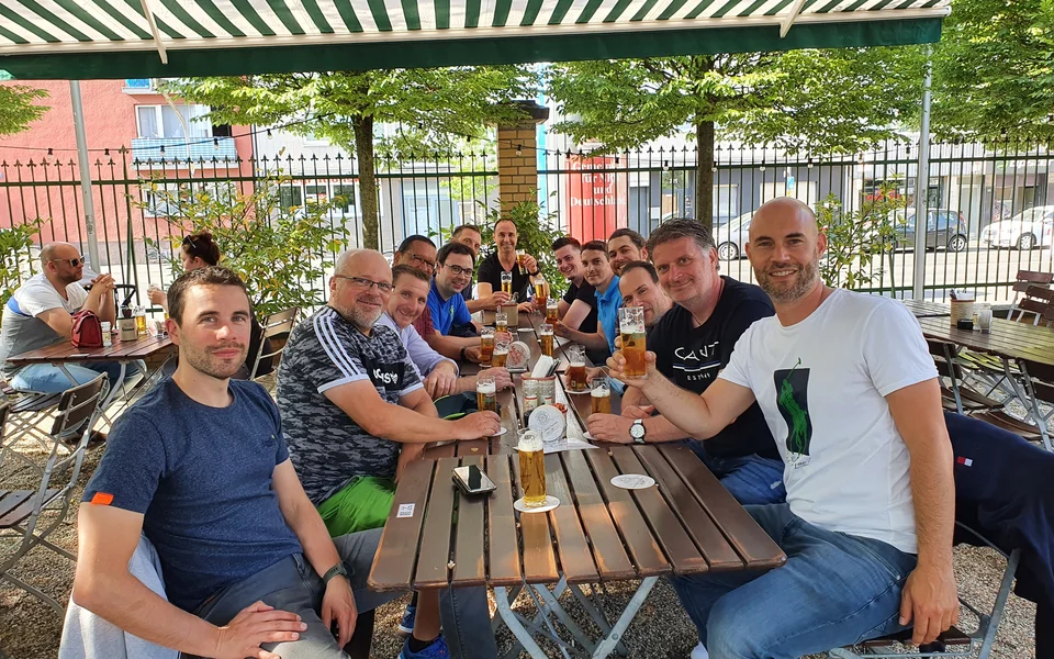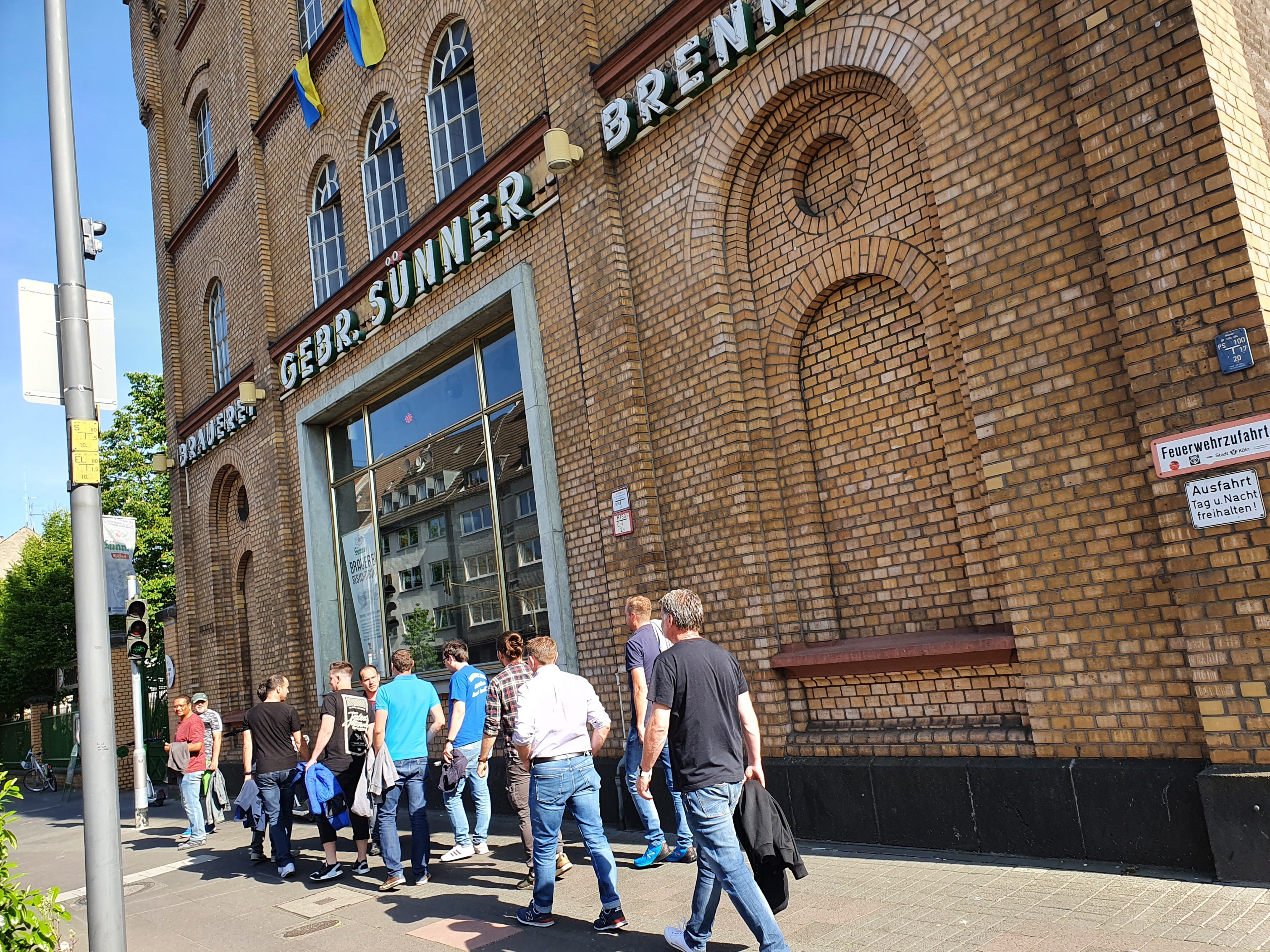 14 wagemutige Mannschaftsmitglieder versammelten sich am vergangenen Samstag zu einer Tour nach Köln. Die RB25 brachte unsere Truppe sicher und pünktlich an die Trimbornstraße. Das Ziel war – nach einem kurzen Fußmarsch – die älteste Kölsch-Brauerei der Welt der Gebrüder Sünner. Neben interessanten Informationen zum Brauprozess gab es auch Einblicke in die Gewinnung von hochprozentigem Alkohol auf Kölner Stadtgebiet. Nach einstündiger Führung hatten unsere Altstars einen gemütlichen Platz im Biergarten mit anschließendem Essen und Verköstigung. Mit Einbruch der Dunkelheit verschob unser Tross dann noch in Richtung Altstadt, die bei bestem Wetter wahrlich gut besucht war, und machte die Nacht vereinzelt zum Tag.