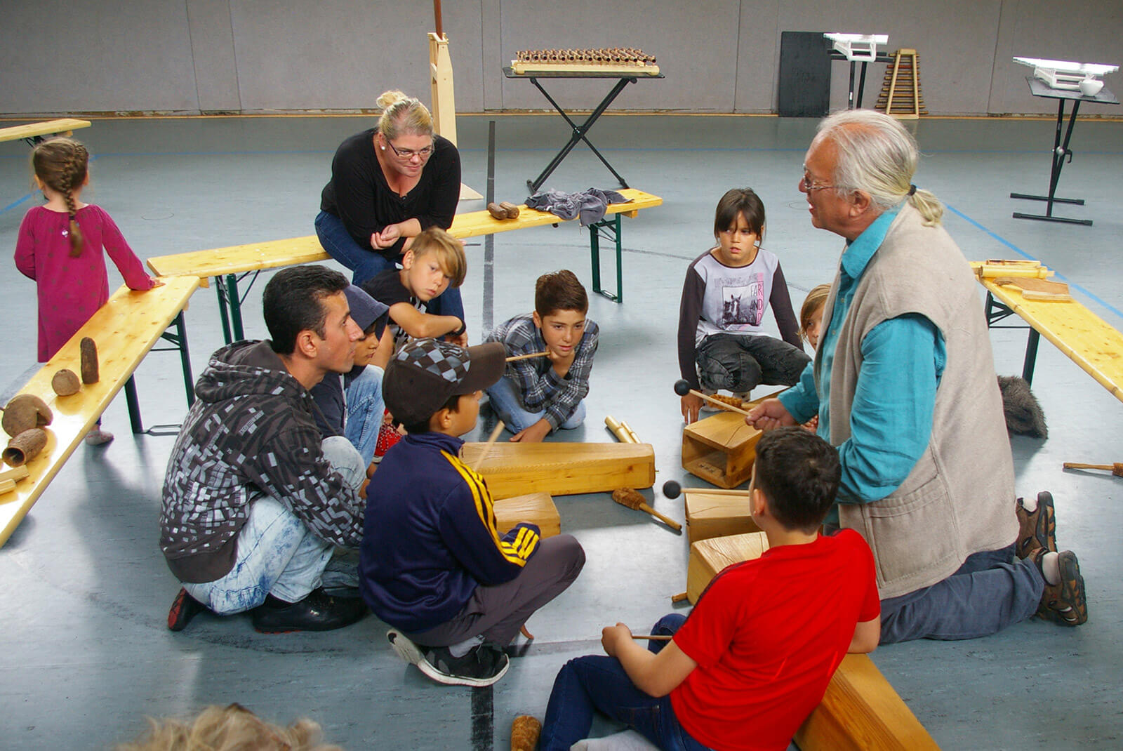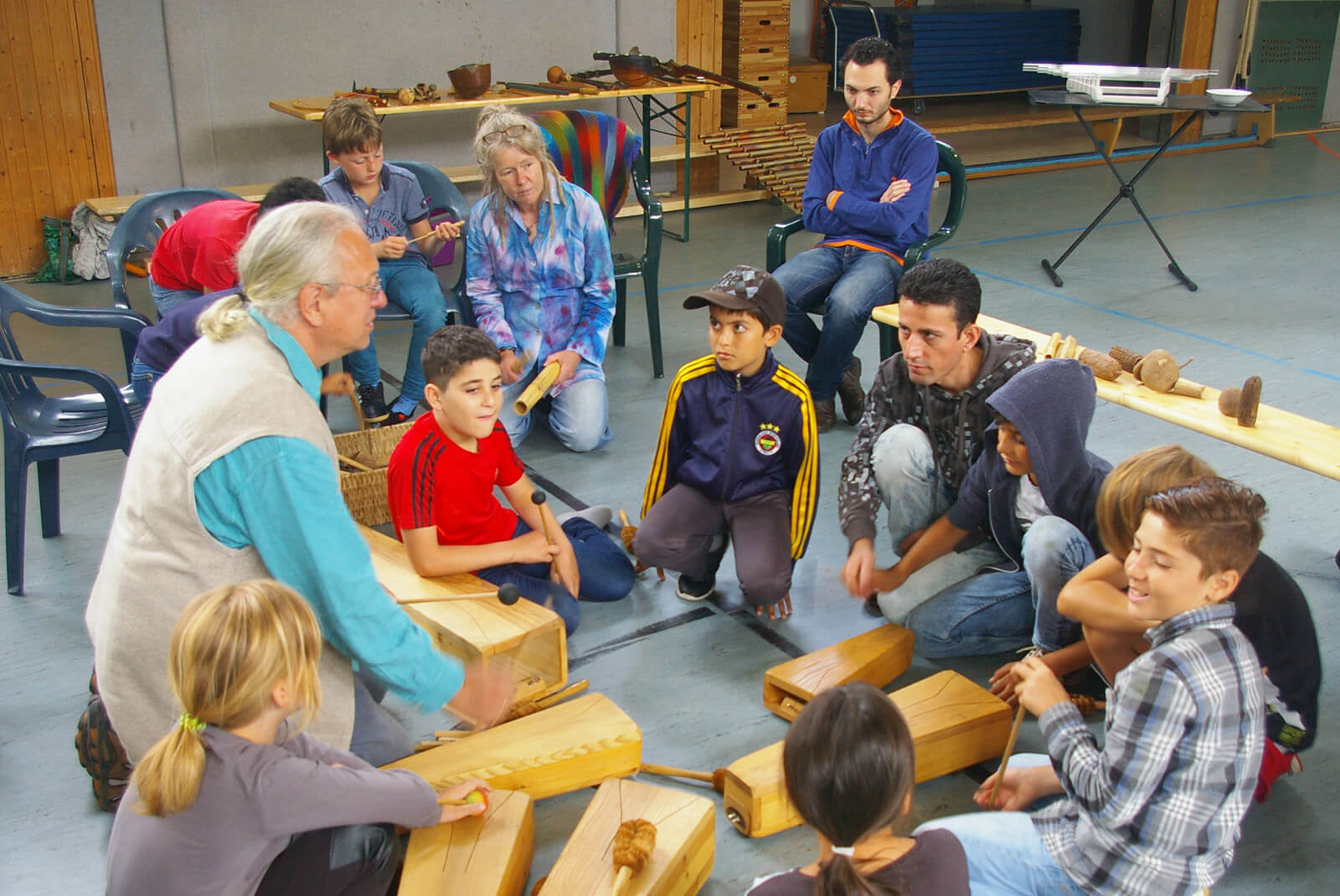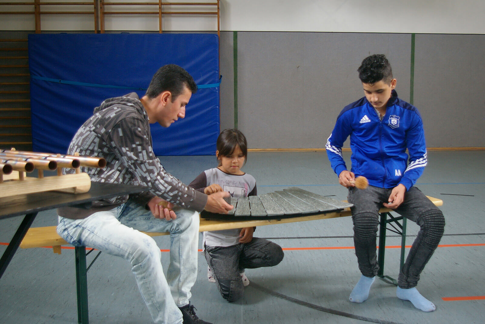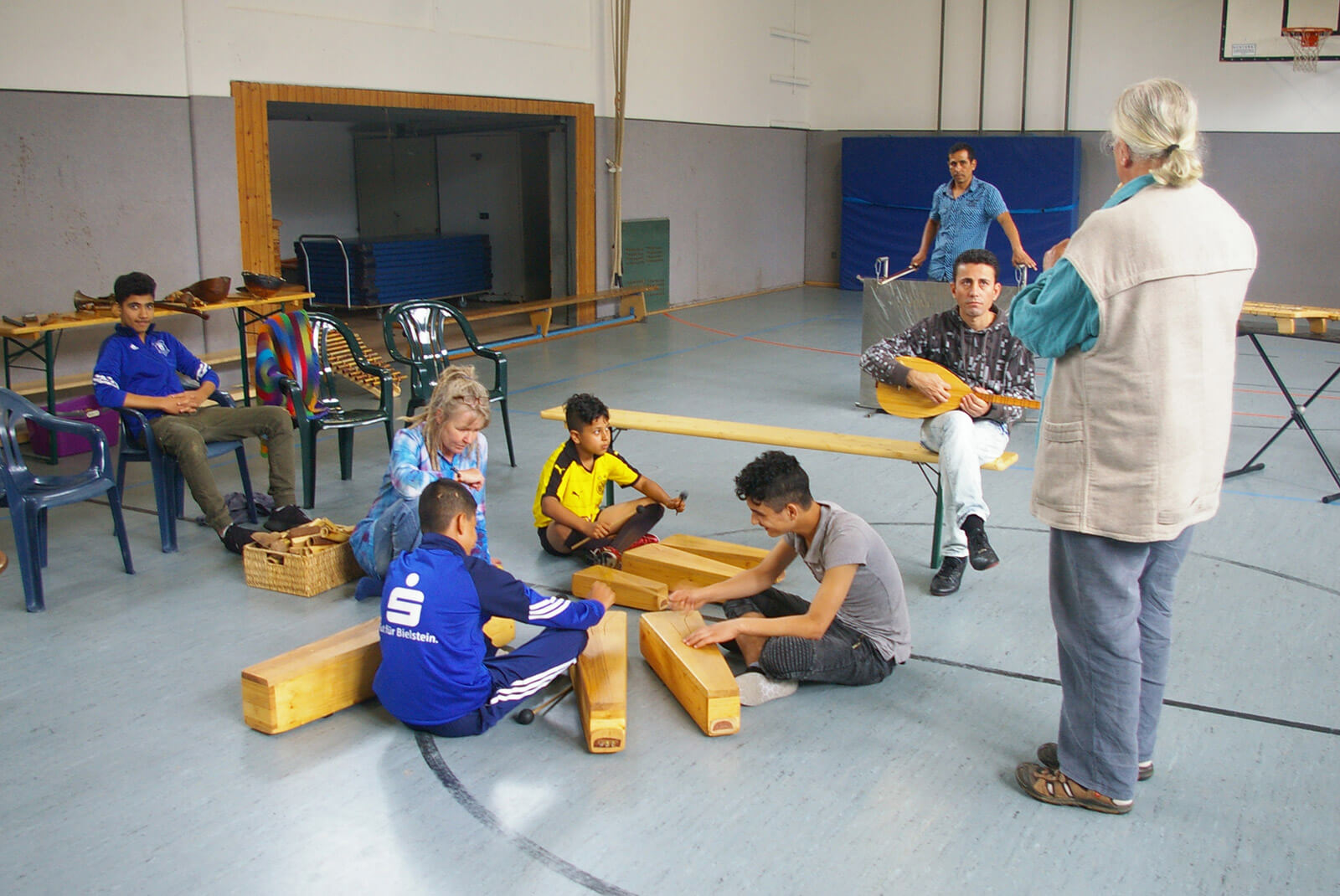 Am Montag, den 24. Juli 2017, veranstaltete unser Verein seinen ersten Musik-Workshop in der Sporthalle Bielstein. Mehr als zwanzig Kinder und Erwachsene formierten sich gemeinsam mit dem Klangkünstler Jochen Fassbender und dem syrischen Musiker Massoud Sulaiman zu einem bunten Orchester.
