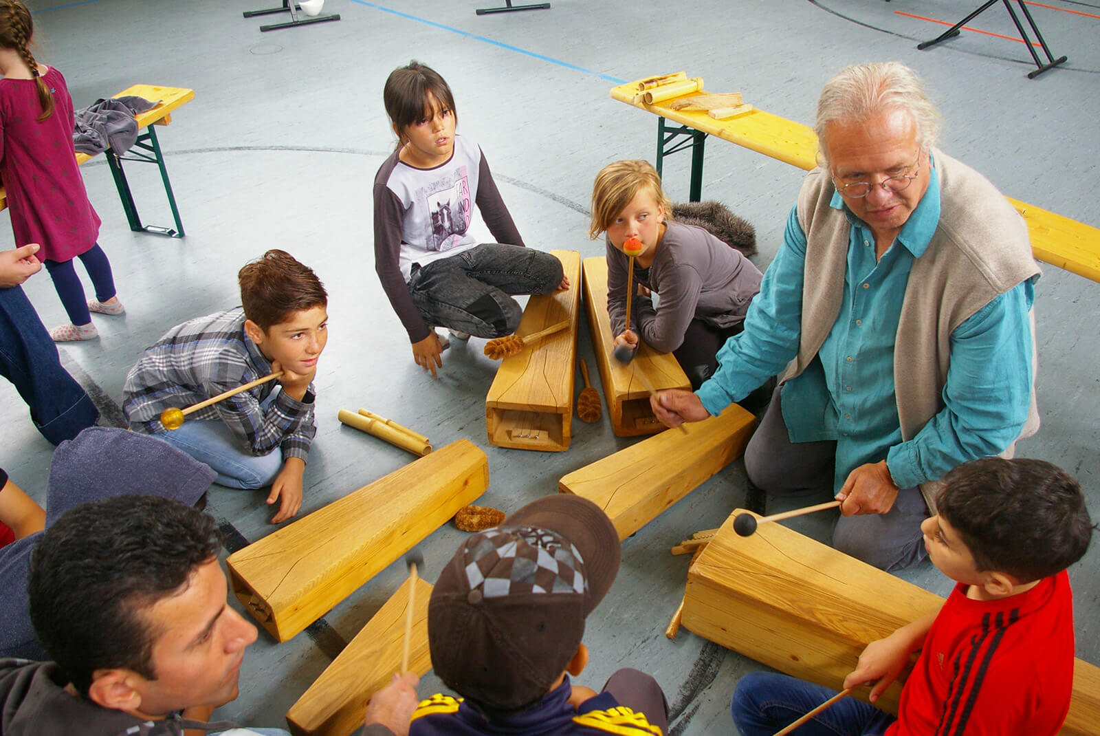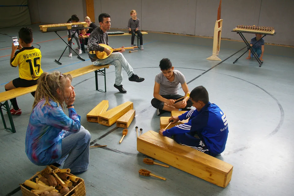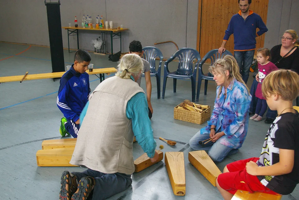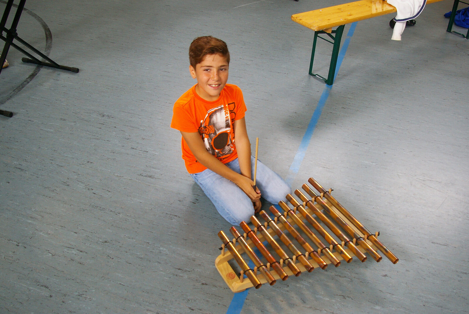 Am Montag, den 24. Juli 2017, veranstaltete unser Verein seinen ersten Musik-Workshop in der Sporthalle Bielstein. Mehr als zwanzig Kinder und Erwachsene formierten sich gemeinsam mit dem Klangkünstler Jochen Fassbender und dem syrischen Musiker Massoud Sulaiman zu einem bunten Orchester.