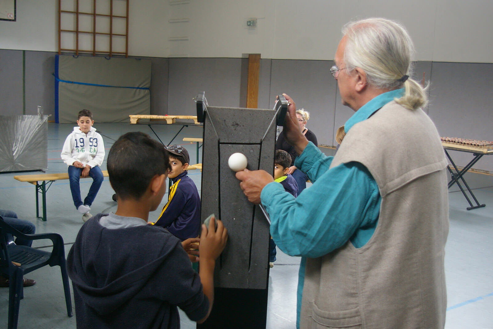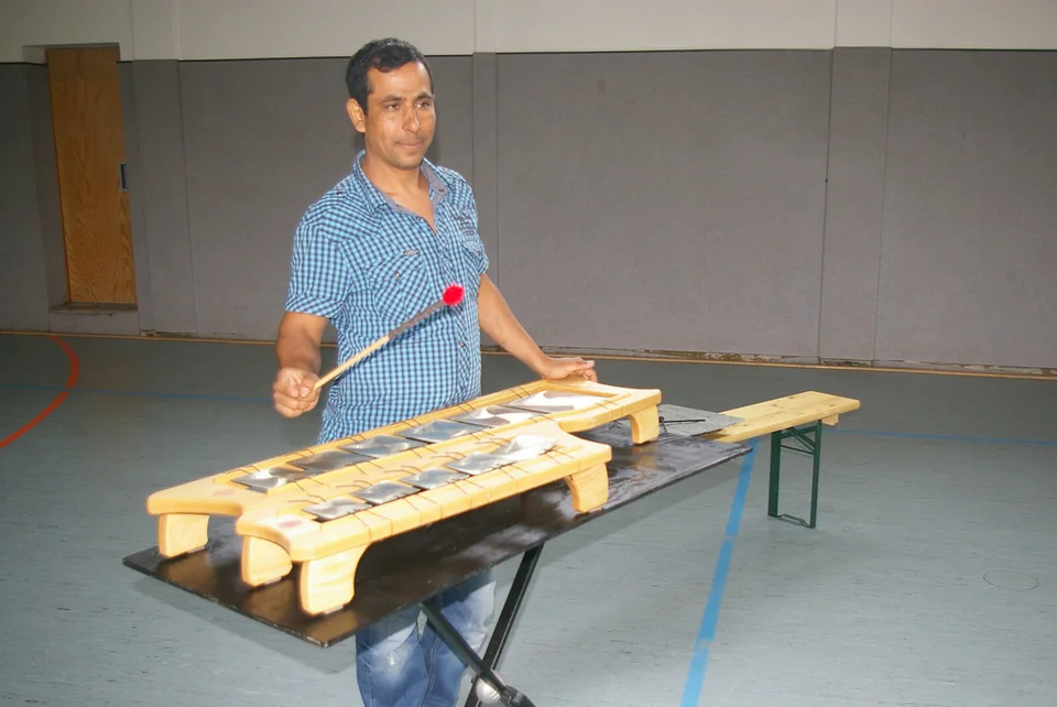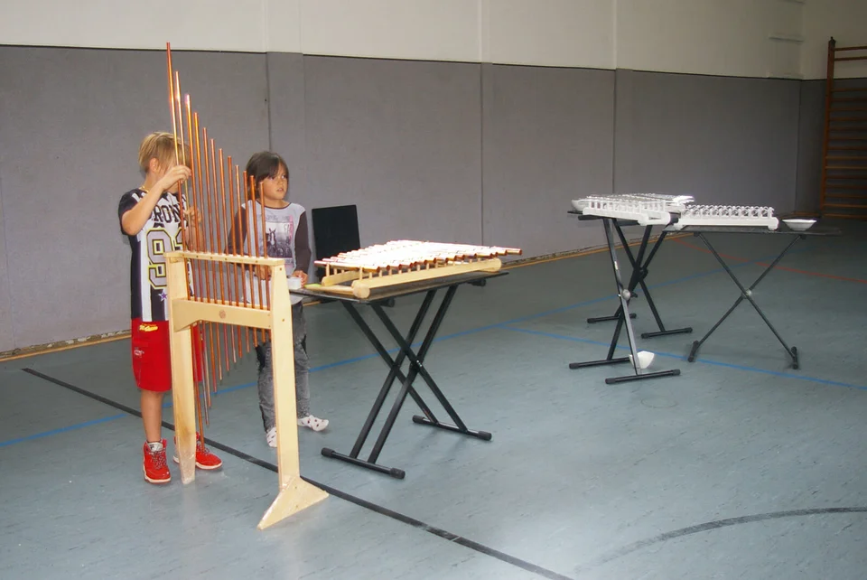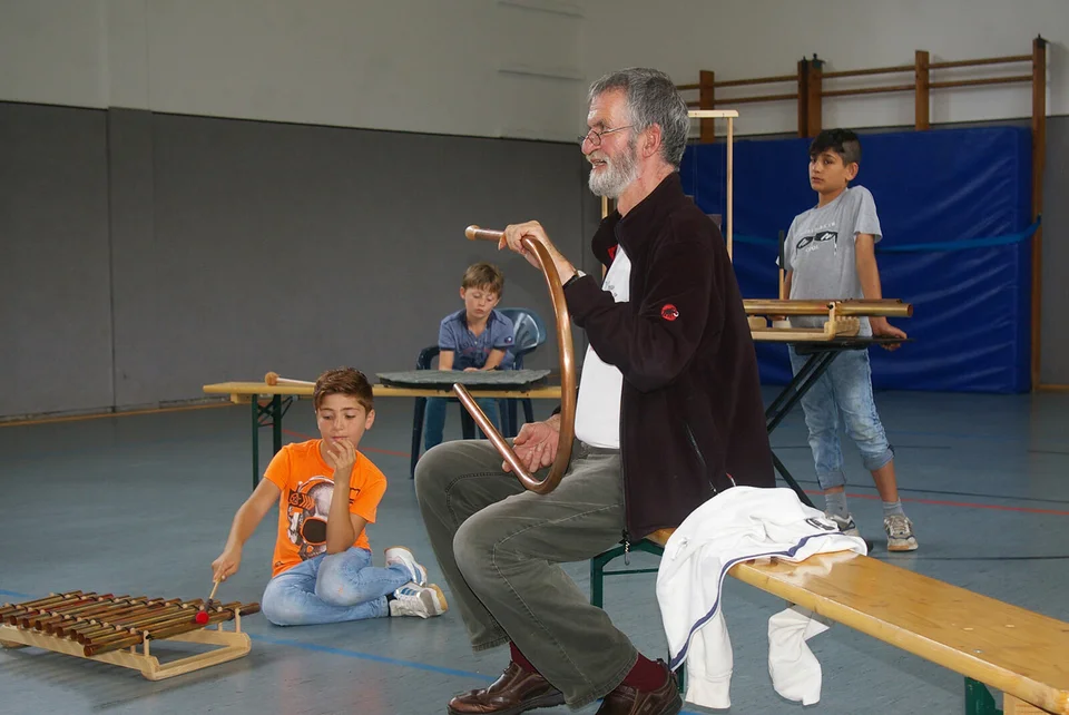 Jochen Fassbender brachte seine selbstgebauten Musikinstrumente aus Stein, Glas, Holz und Metall und Massoud Sulaiman das arabische Instrument Tambur mit in die Sporthalle. Die beiden Musiker führten einen Workshop durch, zu dem unsere Fußballkinder zwischen 8 and 14 Jahren eingeladen waren. Treffpunkt war um kurz nach 10 Uhr und da einige Kinder von einem Elternteil gebracht wurden, machten diese dann kurzerhand auch mit.