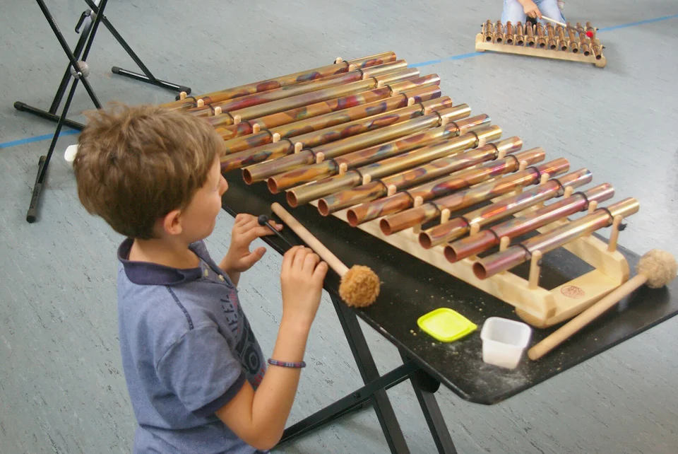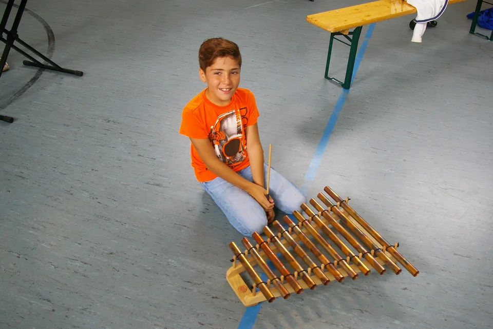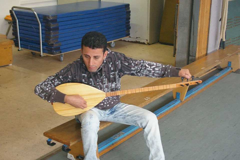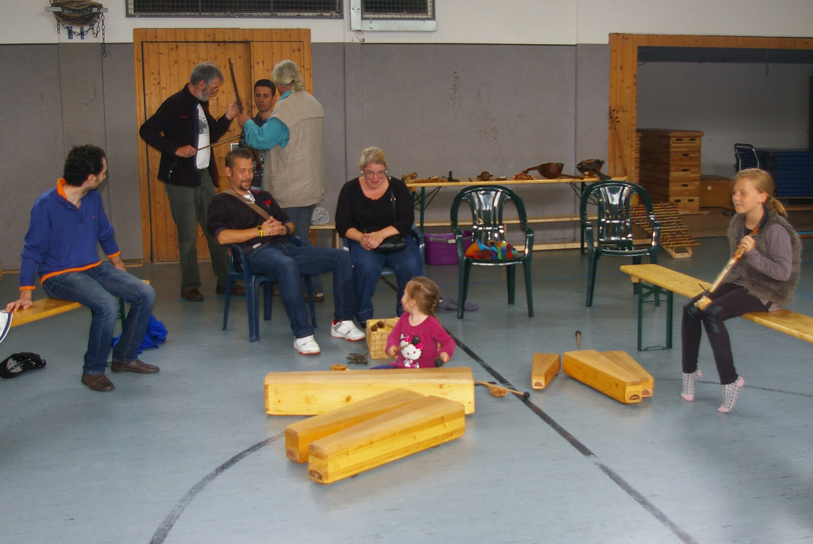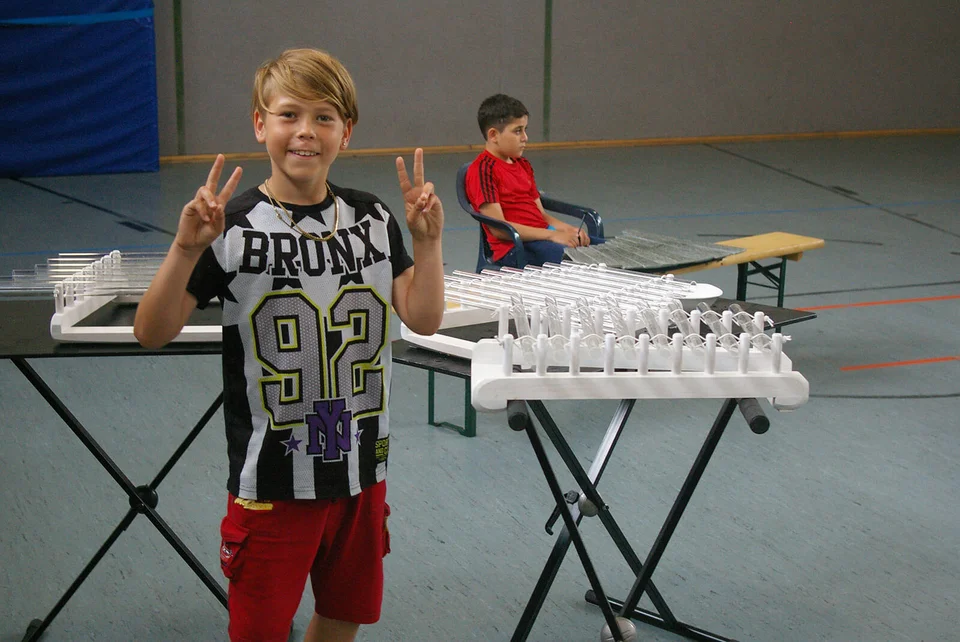 Jochen Fassbender brachte seine selbstgebauten Musikinstrumente aus Stein, Glas, Holz und Metall und Massoud Sulaiman das arabische Instrument Tambur mit in die Sporthalle. Die beiden Musiker führten einen Workshop durch, zu dem unsere Fußballkinder zwischen 8 and 14 Jahren eingeladen waren. Treffpunkt war um kurz nach 10 Uhr und da einige Kinder von einem Elternteil gebracht wurden, machten diese dann kurzerhand auch mit.