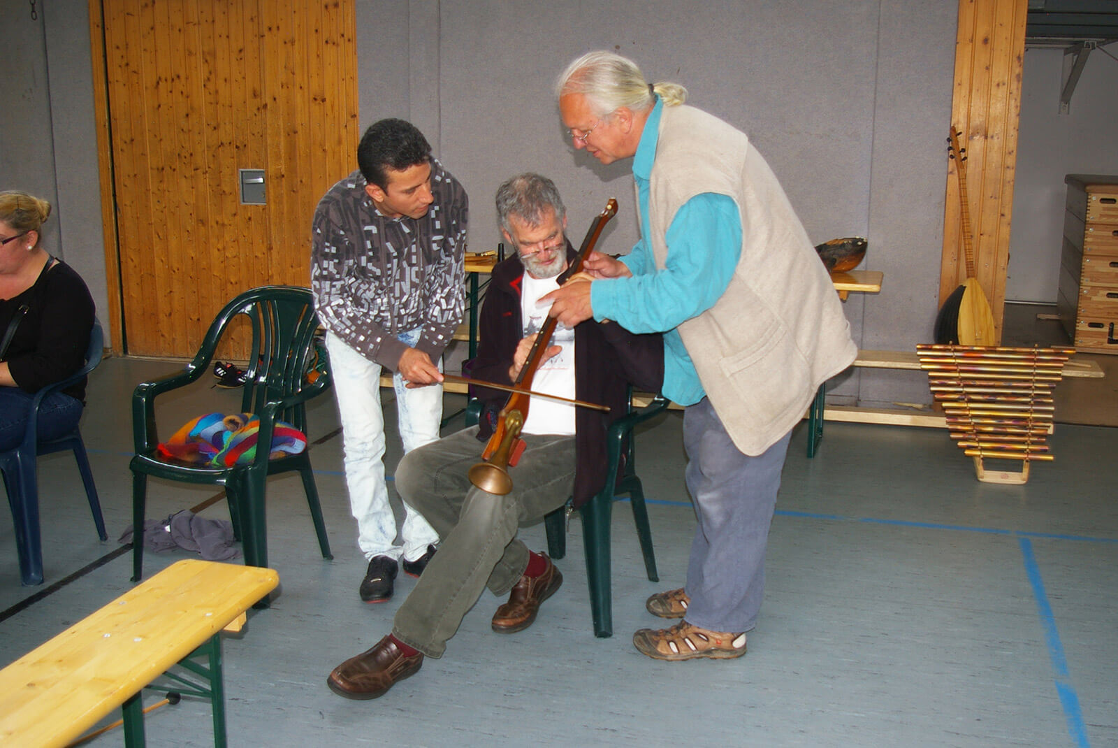 Am Nachmittag war die Zeit gekommen, dass alle zusammen musizierten. Jochen Fassbender war der Dirigent, der mit Zeichen zu verstehen gab, wann wer seinen Einsatz hatte. Dann kam auch Massoud Sulaiman mit seiner Tambur und seinem arabischen Gesang hinzu. Jochen Fassbender spielte eine sehr schön klingende Flöte und alle anderen Instrumente kamen nach und nach zum Einsatz.