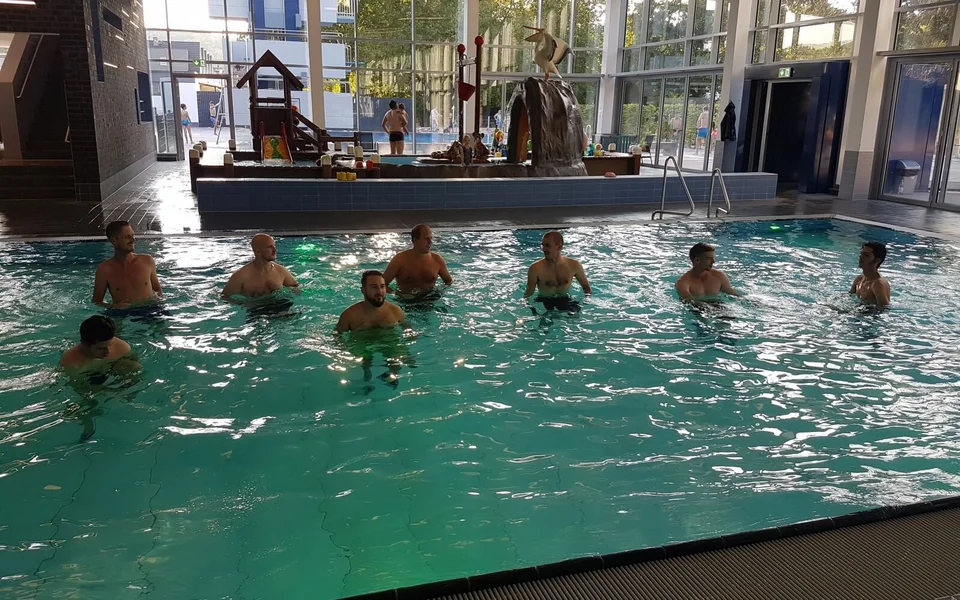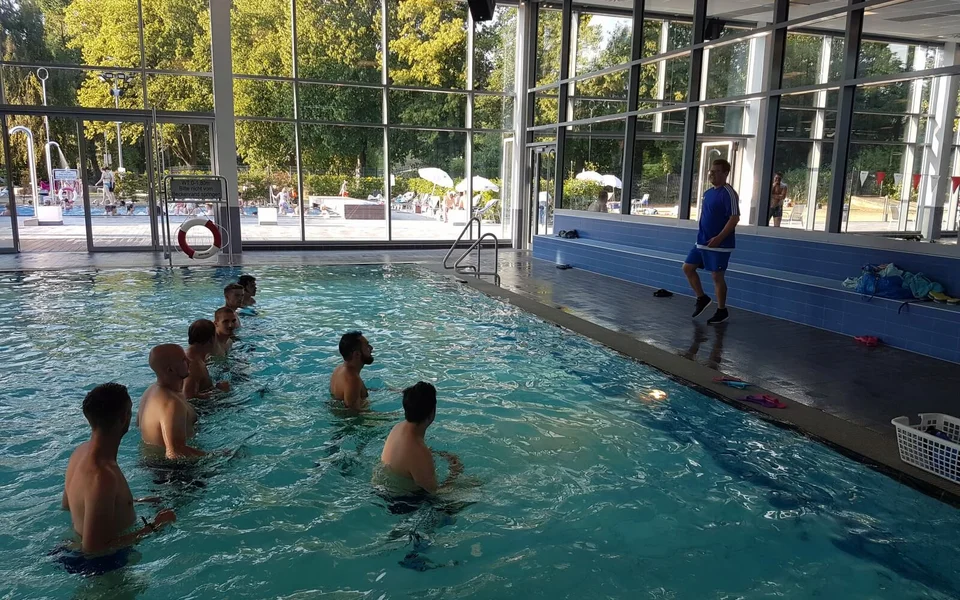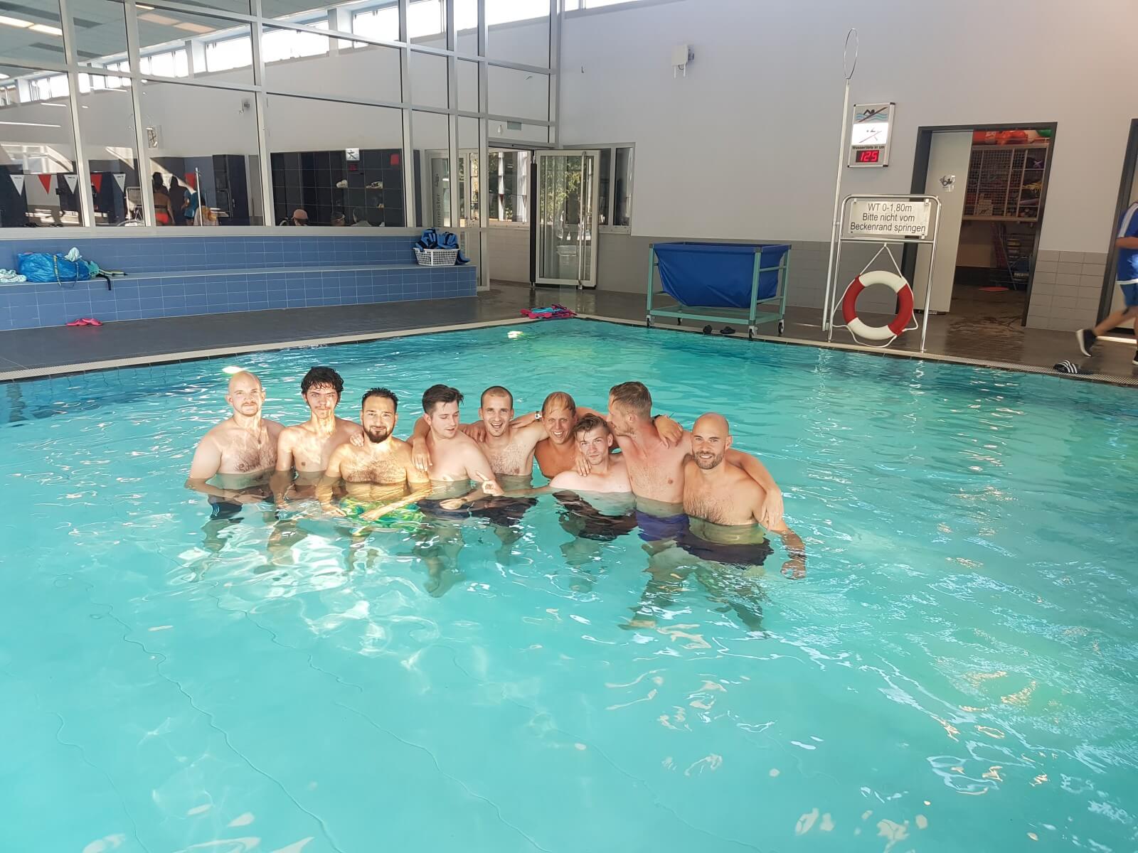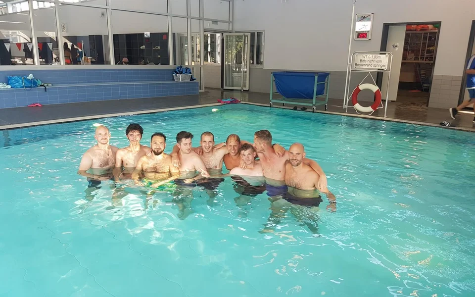Mit einer fachfremden Trainingseinheit stand ein Highlight auf dem Programm der Vorbereitung für die neue Saison. Bei den aktuellen Temperaturen kam unserer Dritten Herren diese Art Trainingseinheit im Wasser gerade recht. Teammitglied und Schwimmlehrer Florian Götte hatte unsere Mannschaft mit allerlei Übungen auf Trab gehalten. Hanteln, Fussgewichte oder Scheiben, welche den Widerstand unter Wasser erhöhen, wurden in die Übungen eingebaut. Ein abgetrenntes Becken, Untermalung mit flotter Musik sowie lichttechnische Unterstützung ließen Urlaubsfeeling aufkommen. Es war aber nur bedingt Urlaub, denn die Form der Forderung des ganzen Körpers war anstrengend und schweißtreibend zugleich sowie für den ein oder anderen Muskelkater zuständig. Gute 60 Minuten verbrachten unsere Spieler mit Lauf- und Ausdauer- sowie Kraftübungen im Wasser, ehe Florian Götte ein Einsehen mit den ausgepowerten Spielern hatte. Anschließend wurden noch ein paar Bahnen geschwommen um wieder locker zu werden.