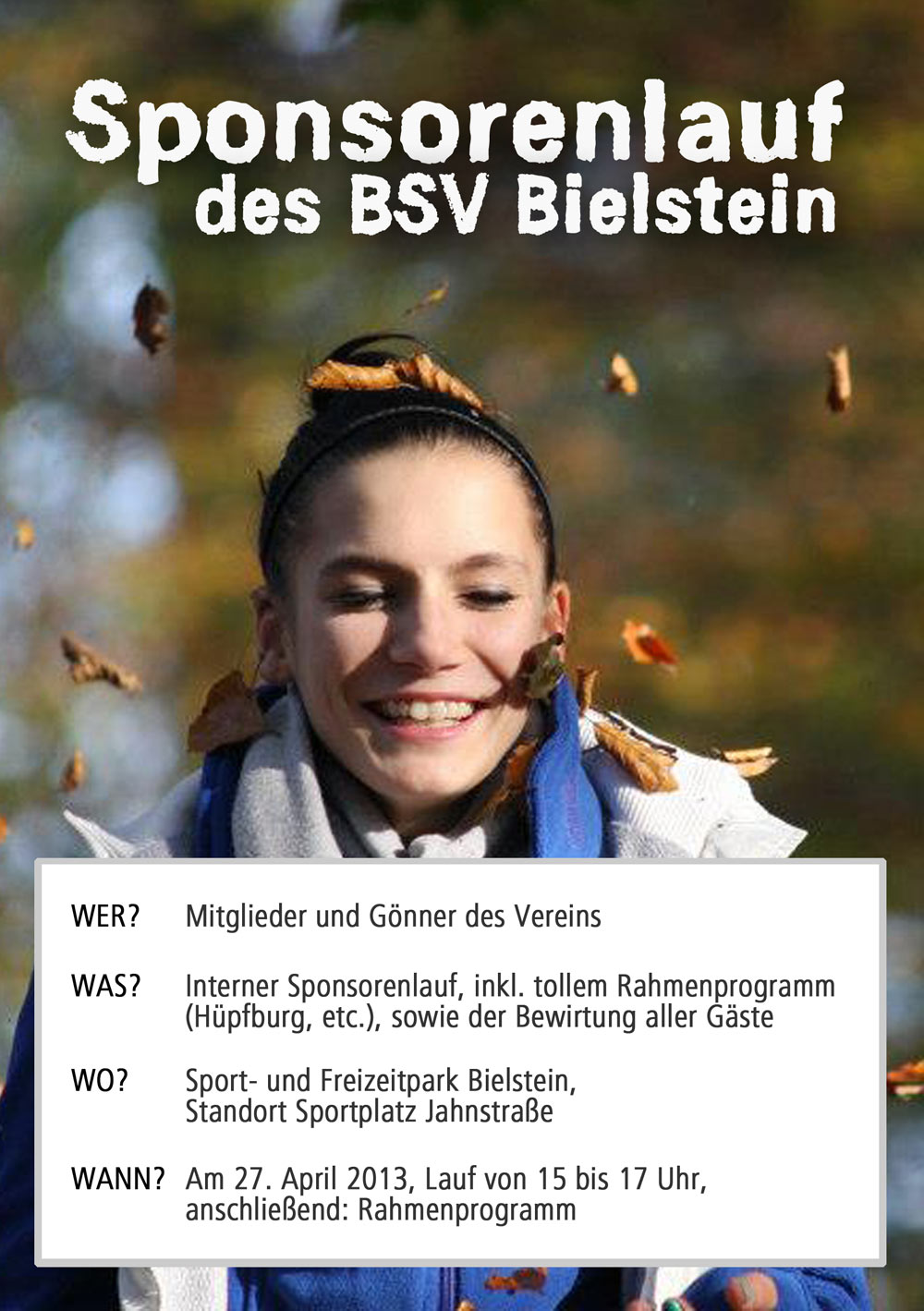 Am 27. April 2013 veranstaltet der BSV Bielstein zwischen 15 und 17 Uhr einen internen Sponsorenlauf mit anschließendem tollem Rahmenprogramm - eingeladen sind alle Mitglieder, Familienangehörige und Gönner des Vereins.