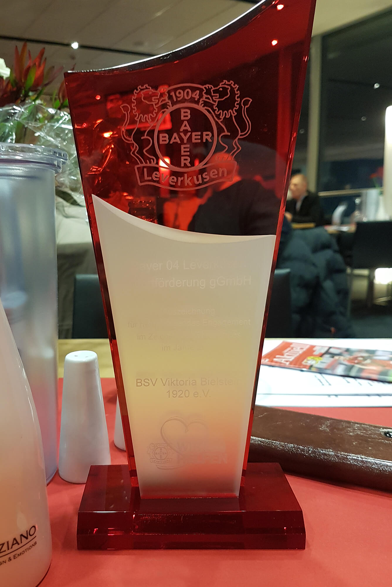 Der BSV Viktoria Bielstein ist einer von zwei Gewinnern des diesjährigen Ehrenamtspreises der Bayer 04 Leverkusen Sportförderung gGmbH, die Vereine aus den Fußballverbänden Mittelrhein (FVM) und Niederrhein (FVN) für ihr vorbildliches Engagement auszeichnet. Im Rahmen des Spiels Bayer 04 Leverkusen gegen Borussia Dortmund wurden wir zusammen mit dem SV Fortuna Millingen unter dem Stichwort „gelebte Integration“ für unsere Integrationsarbeit geehrt.