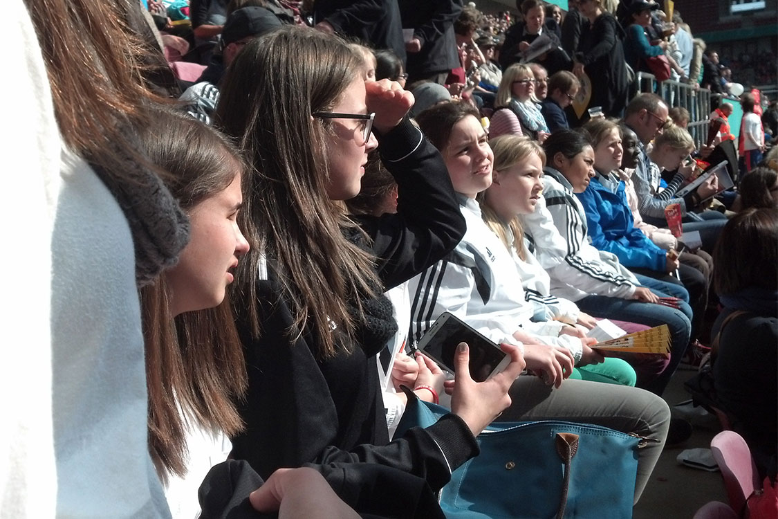 Dabei traf man sich zunächst in Bielstein, um im Anschluss gemeinsam zum Stadion zu fahren. Vor Ort bekamen die Mädchen dann zahlreiche Möglichkeiten geboten, um sich sportlich zu betätigen. Unsere Mädchen ignorierten diese weitestgehend und besannen sich auf das Spiel, das sie interessiert verfolgten. Die Wolfsburgerinnen gewannen letztlich klar und verdient und sicherten sich dadurch zum zweiten Mal in Folge den Pokal. Für unsere Mädchen war der Tag allerdings noch nicht vorbei: auf dem Rückweg ging es zusammen zu einem bekannten Restaurant, wo man den Tag gemeinsam Revue passieren ließ.