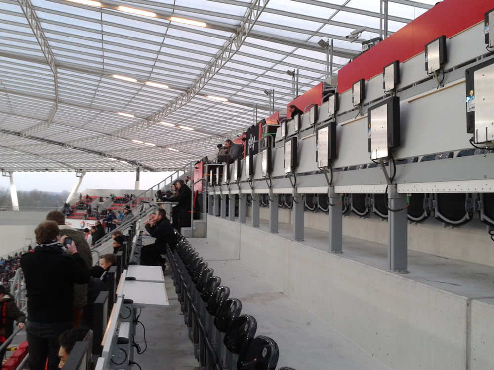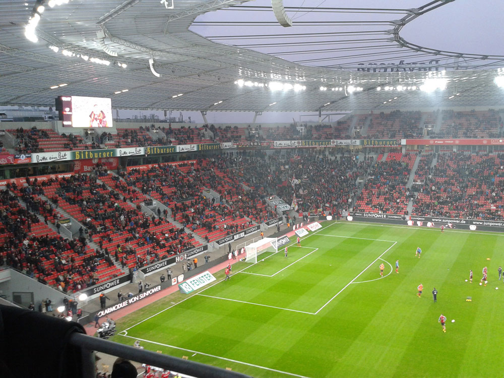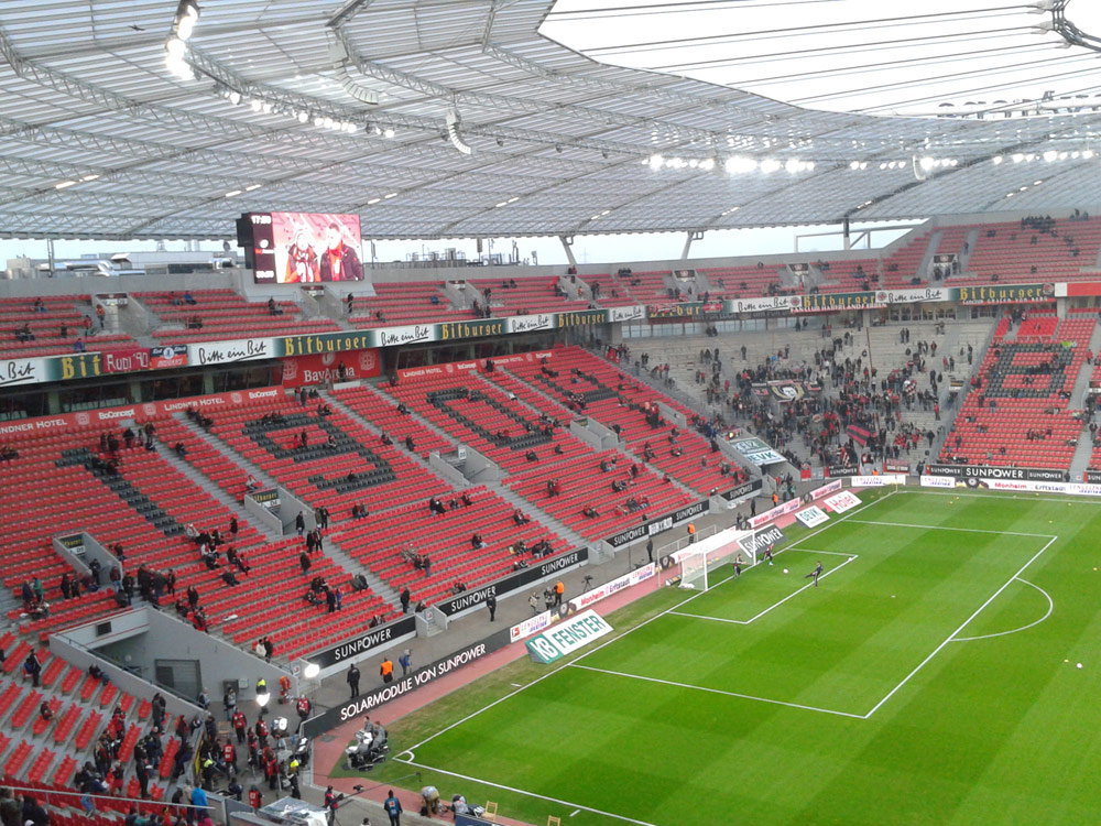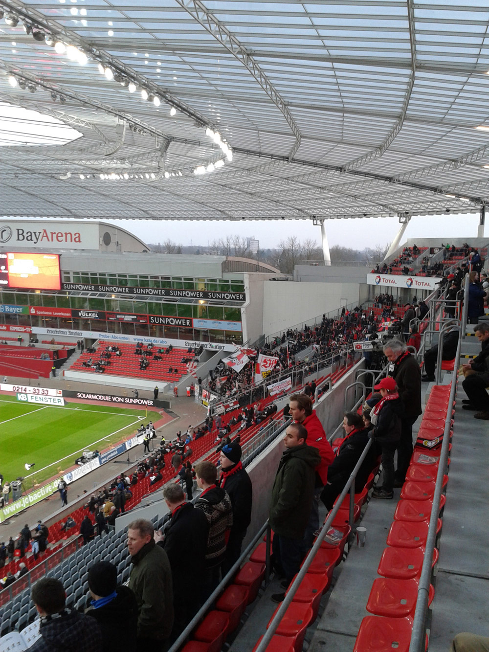 Warum er das tat, wurde uns schnell klar. Stimmung in Form von Fangesängen suchte man schon bei der Ankunft vergeblich. Schlimmer noch die Situation im Stadion: Dort, wo normalerweise die hartgesottenen Fans der eigenen Mannschaft stehen, sitzt man in Leverkusen. Die Stehtribüne, die es gibt, ist dagegen ein „Stehtribünchen“: Sie liegt in einer der kleinen Eckbereiche und war bis kurz vor Spielbeginn noch halbleer. Die Folge: Stuttgart dominierte die BayArena stimmungstechnisch klar und deutlich. Immerhin: Unsere Plätze lagen sehr gut. In unmittelbarer Nähe zu den Dummschwätzern von „Sky“ (Jens Lehmann und Kai Dittmann), „ZDF“ (Wolf-Dieter Poschmann) und den Kollegen von „Sport 1“ (Thomas Helmer) nahm man auf der Westtribüne, sehr mittig gelegen, Platz.