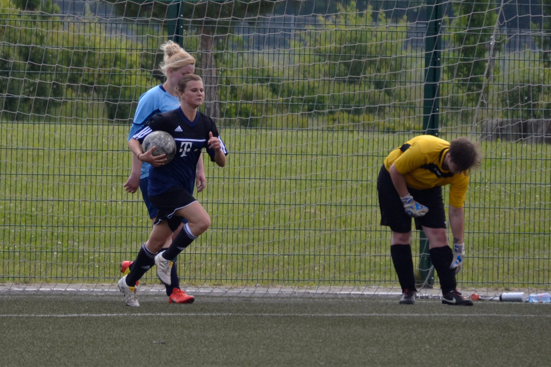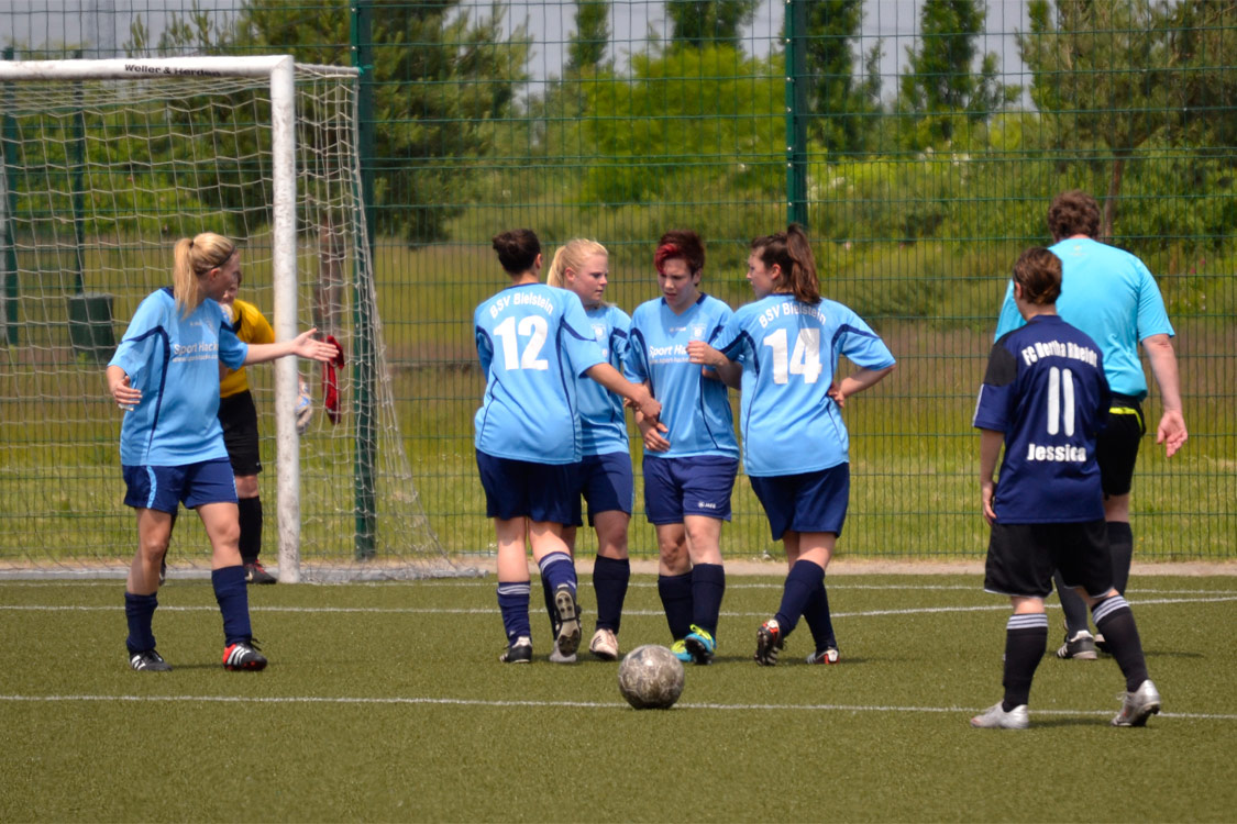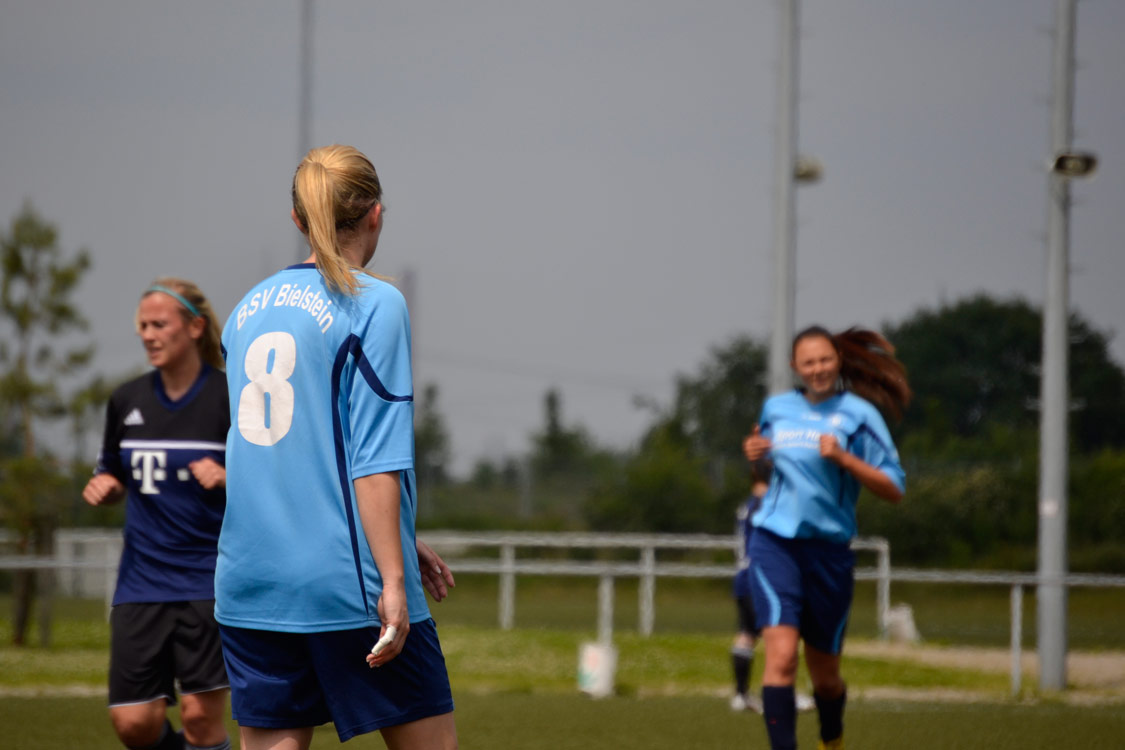 Mit diesem Wissen im Kopf und einer Menge Euphorie und Energie im Körper starteten die Mädchen dann auch ins Spiel. Der Auftakt war furios: nach einem tollen Einwurf von Goli verlängerte Kathi den Ball mit dem Kopf auf Elena. Diese lief gemeinsam mit Katrina auf's Tor zu und legte schließlich quer. Katrina hatte dann keine Probleme mehr, den Ball im Tor zu versenken. Die Führung – erzielt nach nur drei Minuten – ließ die zahlreich mitgereisten Fans ein echtes Stimmungs-Feuerwerk abbrennen. Die Mädels agierten mit der Führung im Rücken dann aber deutlich nervöser und ließen sich zu oft in die eigene Hälfte drängen. Klare Torchancen ließ man währenddessen allerdings nicht zu. Erst ab der 30. Minute konnte man sich durch gute Offensivaktionen wieder etwas aus der Umklammerung befreien. Das wurde dann auch gleich belohnt, denn: auch die dritte Chance der Bielsteiner saß wieder. Die gegnerische Torhüterin hatte einen Freistoß von Lisa nur nach vorne abklatschen lassen. Dort stand Darya und staubte zur wichtigen 2:0 Führung ab. Mit diesem Ergebnis ging es schließlich in die Halbzeit.