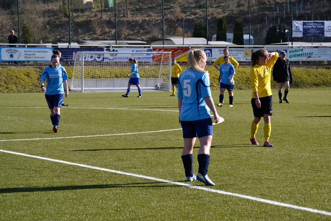 Nachdem die Hohkeppelerinnen die Anfangsphase dominierten und gleich zwei Pfostenschüsse zu verzeichnen hatten, waren es nach 30 Minuten die Bielsteinerinnen, die etwas überraschend in Führung gingen. Mit einem Distanzschuss unter die Latte war Rebecca Boxberg erfolgreich gewesen. Das Tor gab unseren Damen die Sicherheit, die sie für ihr Spiel benötigen. Nur knapp verpasste man in dieser Phase das so wichtige 2:0 – so traf u.a. Chiara Schwarzloh aus einer ähnlichen Position wie beim 1:0 „nur” den Querbalken. Statt mit einer komfortablen Führung ging es also mit einem knappen Halbzeitergebnis in die Pause.