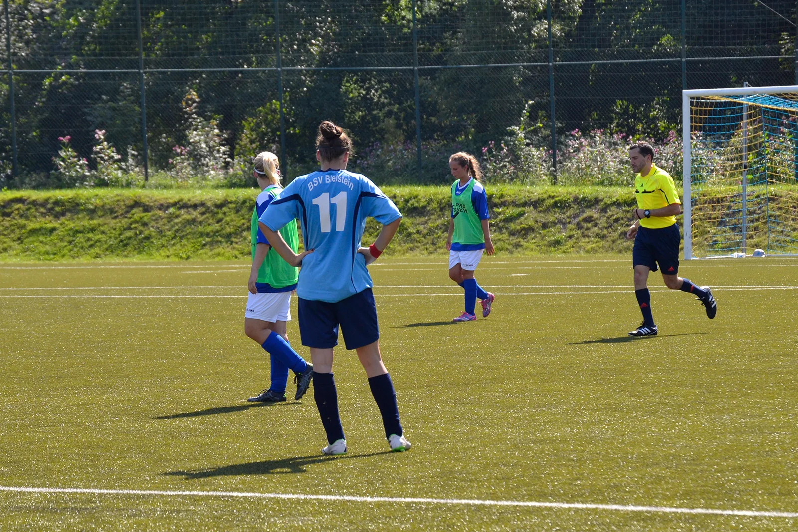 Beide Mannschaften hatten zu Beginn der Partie mit den hohen Temperaturen zu kämpfen, sodass sich weite Teile des Spiels zunächst im Mittelfeld abspielten. Unsere Damen agierten insgesamt zu hektisch und spielten die Angriffe einfach nicht gut zu Ende. Das sollte sich schnell rächen: nach einer Ecke ging Biesfeld wie aus dem Nichts mit 0:1 in Führung. Unsere Damen wachten nun auf, erspielten sich deutlich mehr Torchancen und übernahmen dadurch die Kontrolle. Chiara scheiterte mit einem wunderschönen Freistoß zunächst noch am Lattenkreuz. Kurz darauf dann die Erlösung: Annalena und Chiara kombinierten sich mit mehreren Doppelpässen gut über die rechte Außenbahn durch. Aus fast schon unmöglicher Position fasste sich Annalena schließlich ein Herz und drosch den Ball von der Außenlinie ins hohe lange Eck zum verdienten 1:1 Ausgleich. Dieses Ergebnis war auch zugleich der Halbzeitstand.