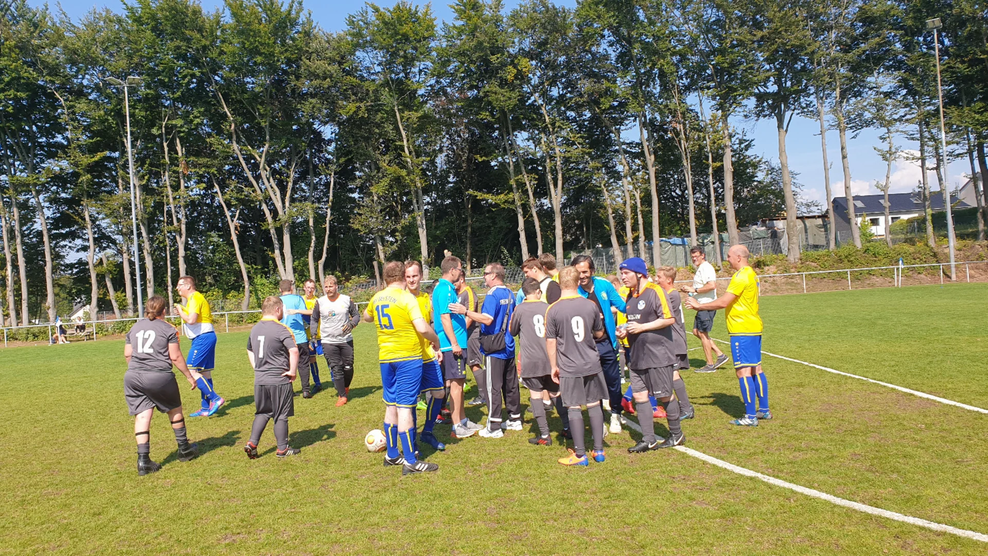 Dieser Gegner war mit der DJK SSV Ommerborn Sand aus dem Rheinsch-Bergischen Kreis schnell gefunden. Die Planung zum Spiel hatten BSV-Geschäftsführer Christopher Pethe und DJK-Trainer Jürgen Münsterteicher bereits im letzten Jahr aufgenommen, doch dann kam leider der Lockdown dazwischen. Dank der Kooperation zwischen dem BSV Bielstein, der BWO und dem HBW waren auch einige Spieler:innen aus diesen Einrichtungen mit dabei. Neben den Trainern Mohamed Rezgui, Maik Noß und Betreuerin Tina Noß, wurde die Mannschaft auch von HBW-Mitarbeiterin Natascha Schumann-Frackenpohl begleitet, die einige Spieler im HBW-Bus zum Auswärtsspiel mitnehmen konnte. Und natürlich ließen sich auch viele Eltern und Freunde das Spiel nicht entgehen.