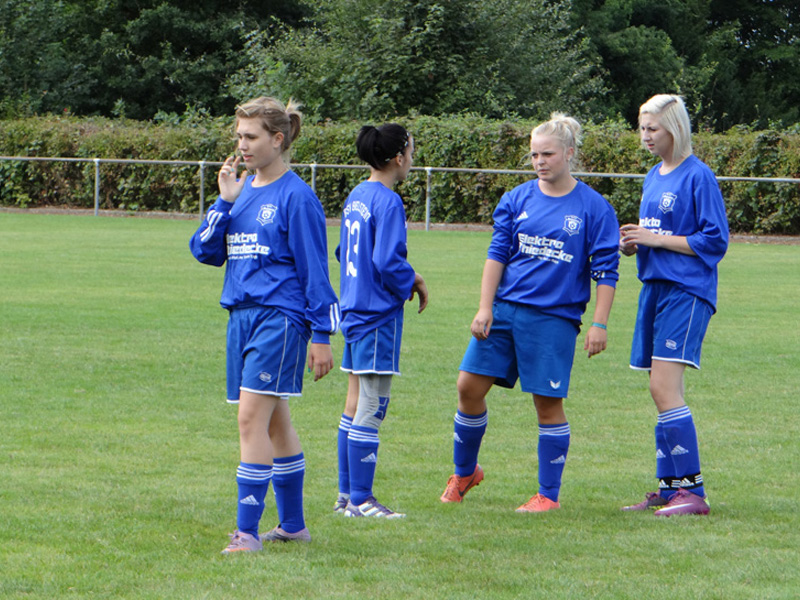 Eine gute Vorgabe: denn bereits in der zweiten Spielminute führte eine Ballstaffette über Kira, Jenny und Tokessa zum Führungstreffer durch unsere Stürmerin Toki. Und auch im weiteren Spielverlauf zog man eine deutsche Variante des „Tikitaka“ auf, in dem man dem spanischen Vorbild nur beim Torabschluss nachstand. So dauerte es weitere 18 Minuten, bis Jenny Völker nach wunderbarer eigener Balleroberung aus spitzem Winkel zum 2:0 traf. Nun ging es Schlag auf Schlag: nach einer der wenigen Offensivaktionen der Lindlarer machte Eugenie das Spiel schnell und warf den Ball zu Jenny. Diese passte Toki den Ball in den Lauf, die mit ihrem zweiten Treffer zum 3:0 traf. Weitere 8 Minuten später war der (wenn auch nicht lupenreine) Hattrick perfekt: Ballgewinn Celin, leichte Irritationen ob eines nicht abgepfiffenen Zweikampfes und der Pass in die Schnittstelle auf Toki, die mit ihrer vierten Chance ihren dritten Treffer erzielte. Wenig später pfiff die ordentlich pfeifende Lindlarer Schiedsrichterin zur Halbzeit ab.