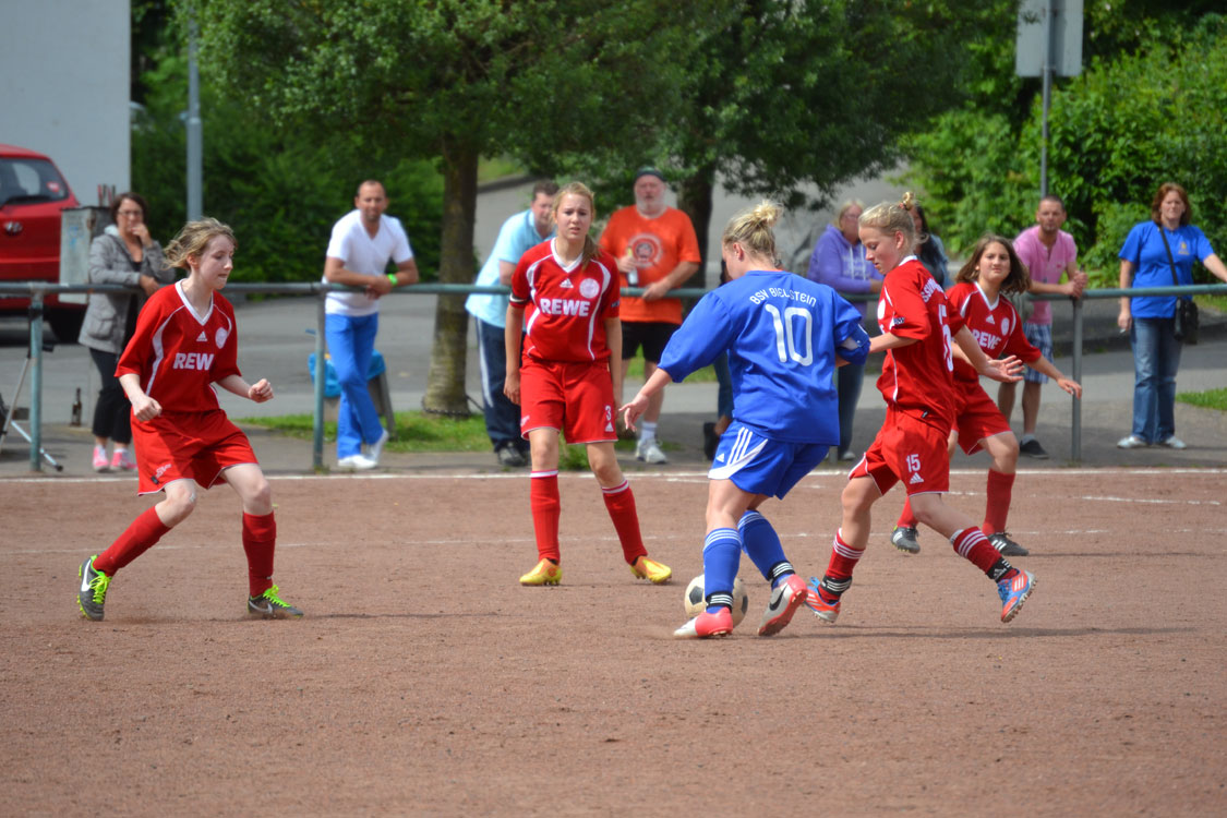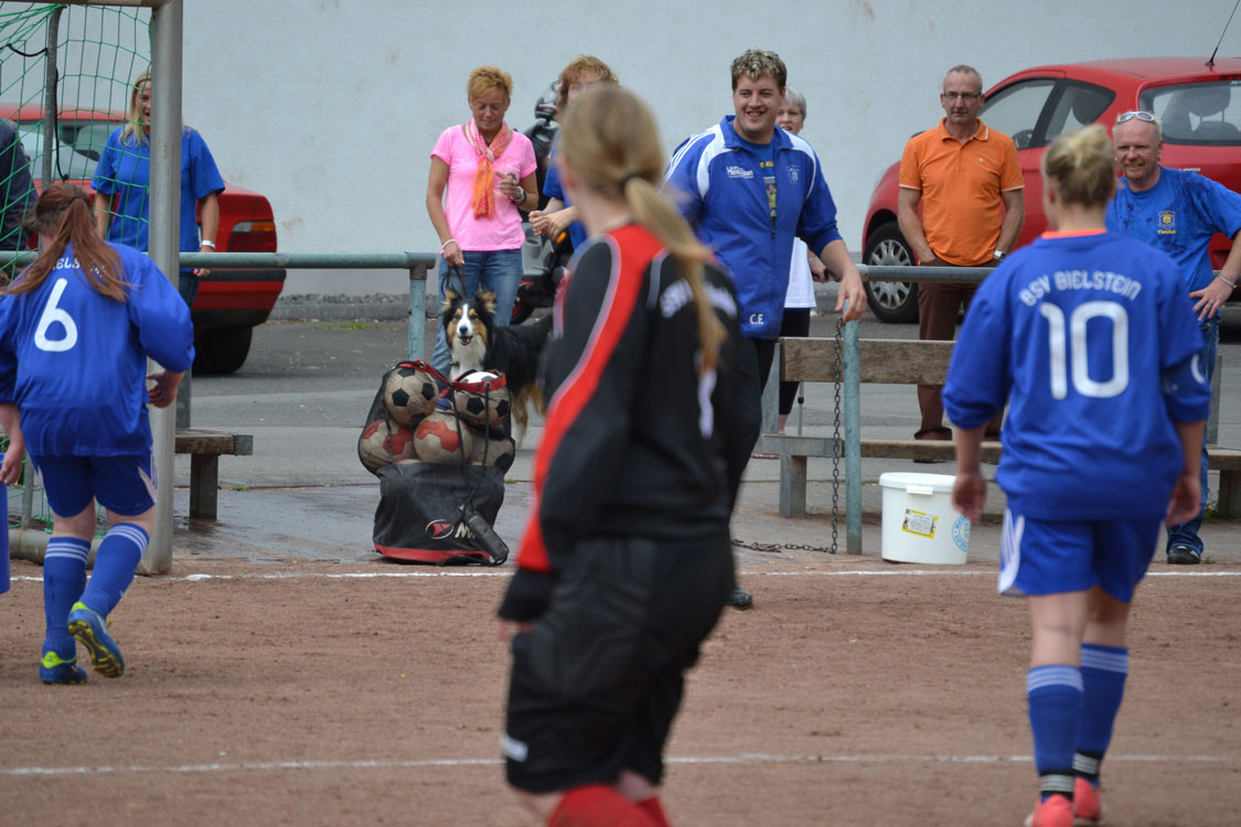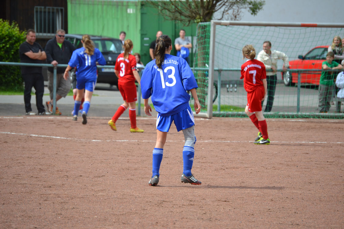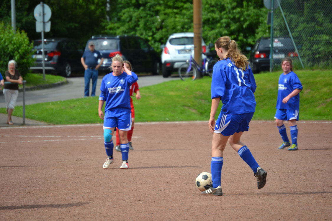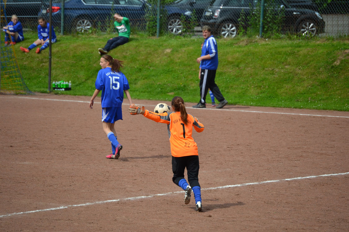 Die Mädchen hatten noch eine Rechnung zu begleichen und wollten die Niederlage aus dem Hinspiel wettmachen. Die bis in die Haarspitzen motivierten Mädchen legten dann auch furios los. Schon nach wenigen Sekunden gab es den ersten Eckball. Annalena lief an und platzierte den Ball dermaßen gut vor das gegnerische Tor, dass die Marienheiderinnen den Ball vor lauter Überraschung ins eigene Netz beförderten. In der Folge zeigte die Mannschaft erneut, warum sie an der Tabellenspitze steht. Die wahnsinnig stabile Abwehr konnte die zahlreichen Zuschauer wieder einmal mit einer starken Leistung überzeugen. Lediglich einzelne Fernschüsse konnten unsere Eule davon überzeugen, ihren geliebten Torpfosten während des Spiels für wenige Sekunden zu verlassen. Auch in der Offensive wurde der Druck immer stärker. Der Bann war gebrochen, als Toki einen schönen Pass zu Sarah spielte, diese ihre Gegenspielerinnen stehen ließ und den Ball links unten einnetzte. Von nun an war die Sicherheit da. Beim dritten Treffer war es erneut Stürmerin Tokessa, die mit ihrer Übersicht Sarah in der Mitte bediente. Unsere Kapitänin ließ der Torhüterin mit einer Direktabnahme ins untere linke Eck wiederum keine Chance. Kurz darauf war Halbzeit.