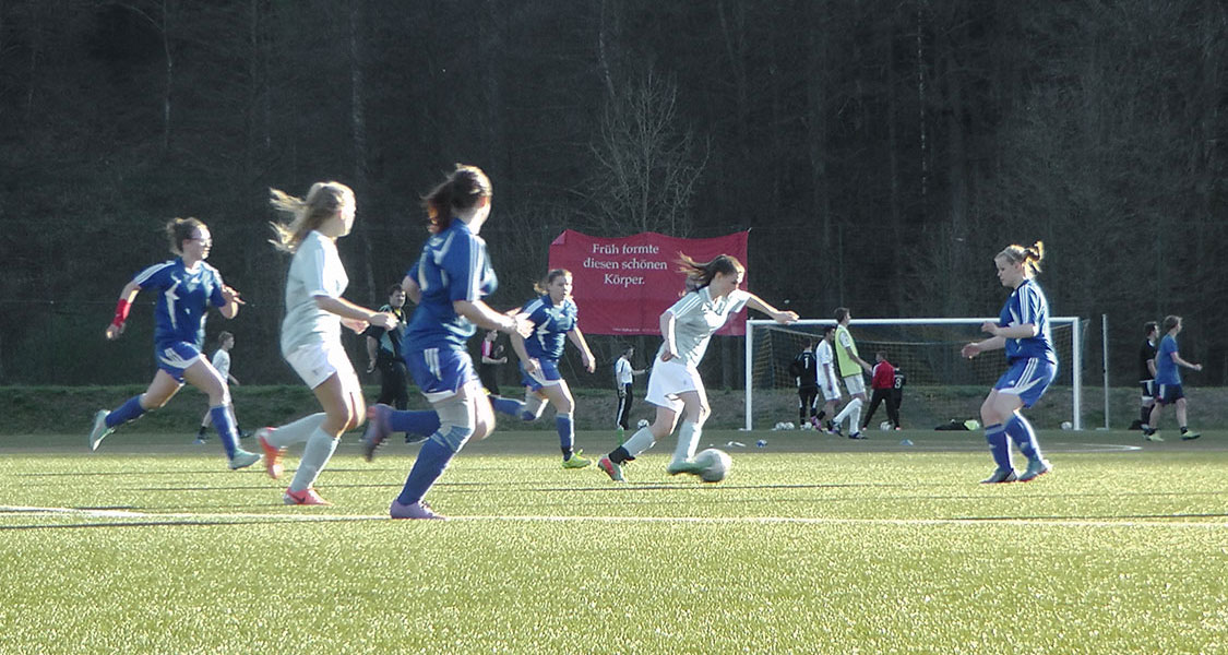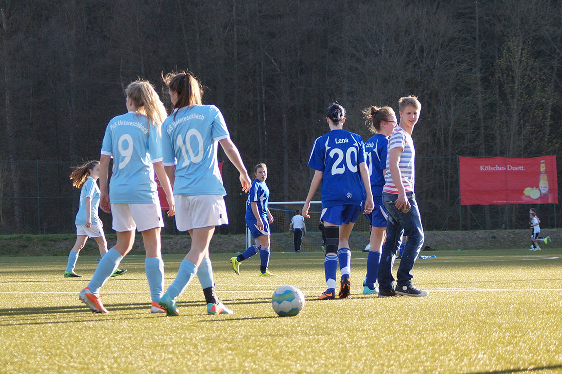 Unsere U17 Mädchen begannen gut und übernahmen vom Anpfiff weg das Kommando über das Spiel. Erst im weiteren Verlauf fanden auch die Gäste aus Untereschbach etwas besser in die Partie und kamen ihrerseits zu einigen guten Torchancen, die aber entweder von der sehr aufmerksamen Abwehr oder aber von unserer Nummer Eins im Tor – Eugenie Sawinkin – abgewehrt werden konnten. Gerade in der Phase als Untereschbach etwas an Dominanz zu gewinnen schien, schlugen unsere Mädchen dann zu: nachdem sich Annalena Müllenmeister den Ball zunächst in der eigenen Hälfte zurückerkämpfen konnte, setzte sie sich im Anschluss mit einem schönen Dribbling gegen die gesamte Untereschbacher Hintermannschaft durch und schloss schließlich mit dem rechten Fuß ab. Der Torschuss trudelte an der Torhüterin vorbei zur Führung ins Netz. Die Führung war wichtig, gab den mit zahlreichen Verletzungen in die Partie gegangenen Mädchen aber nicht die Sicherheit, die sie für ihr Spiel benötigten. So schwankte das Spiel in den darauf folgenden zwanzig Minuten weiter hin und her. Erst nach einer guten halben Stunde (!) kam Bielstein zu seiner zweiten Möglichkeit. Diese saß dann aber gleich wieder: nachdem Linda den Ball in der 33. Spielminute zunächst freistehend quer zu Annalena spielen durfte, hatte unsere Flügelflitzerin keine Mühe damit, den Ball aus gut und gerne 20 Metern im linken unteren Eck zu verwandeln – das 2:0. Dieses Ergebnis war gleichbedeutend mit dem Halbzeitstand.