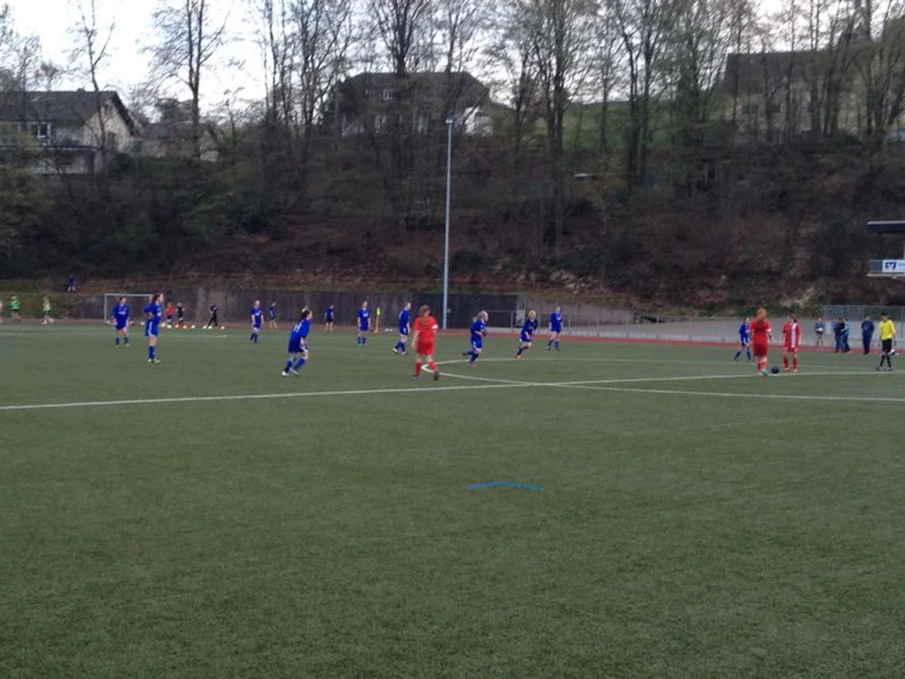 Den Start dieser wichtigen Partie verschliefen unsere Mädchen komplett. So geschah es, dass man bereits nach kurzer Zeit durch eine Verkettung von individuellen Fehlern mit 1:0 in Rückstand lag. Nach dem Gegentor wurde die Mannschaft noch nervöser. Es half nur noch eins: kämpfen bis zum Umfallen. Und das taten die Mädchen dann auch. Mit Erfolg: mit einem strammen Schuss traf Sarah nach Vorarbeit von Jacy zum wichtigen 1:1. Durch den Ausgleich bekam die Mannschaft wieder mehr Sicherheit. Sie kamen jetzt über beide Außenbahnen oder durch lange Bälle zu ihren Chancen, die allerdings zunächst leider nicht genutzt werden konnten. So ging man mit einem leistungsgerechten Unentschieden in die Halbzeitpause.