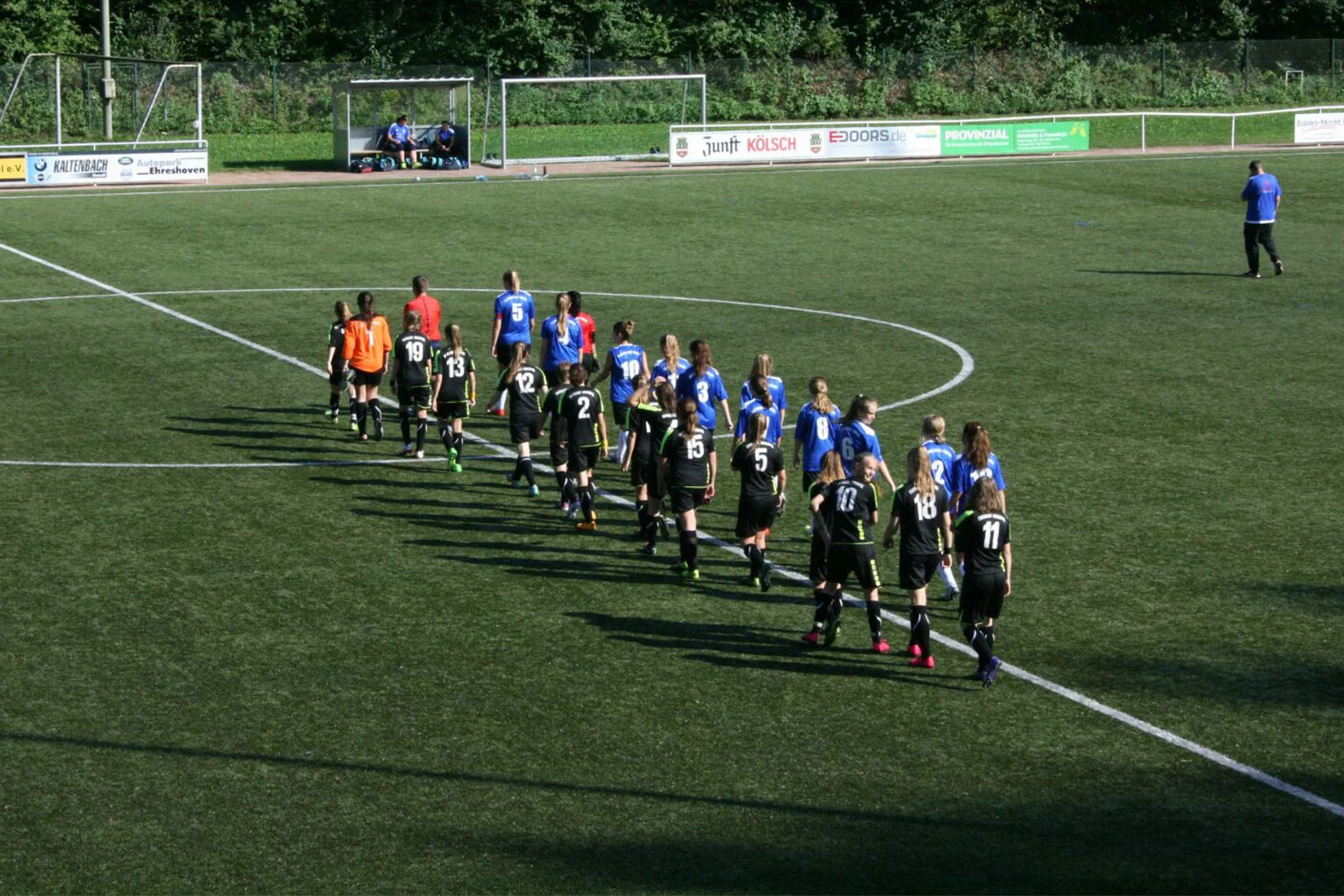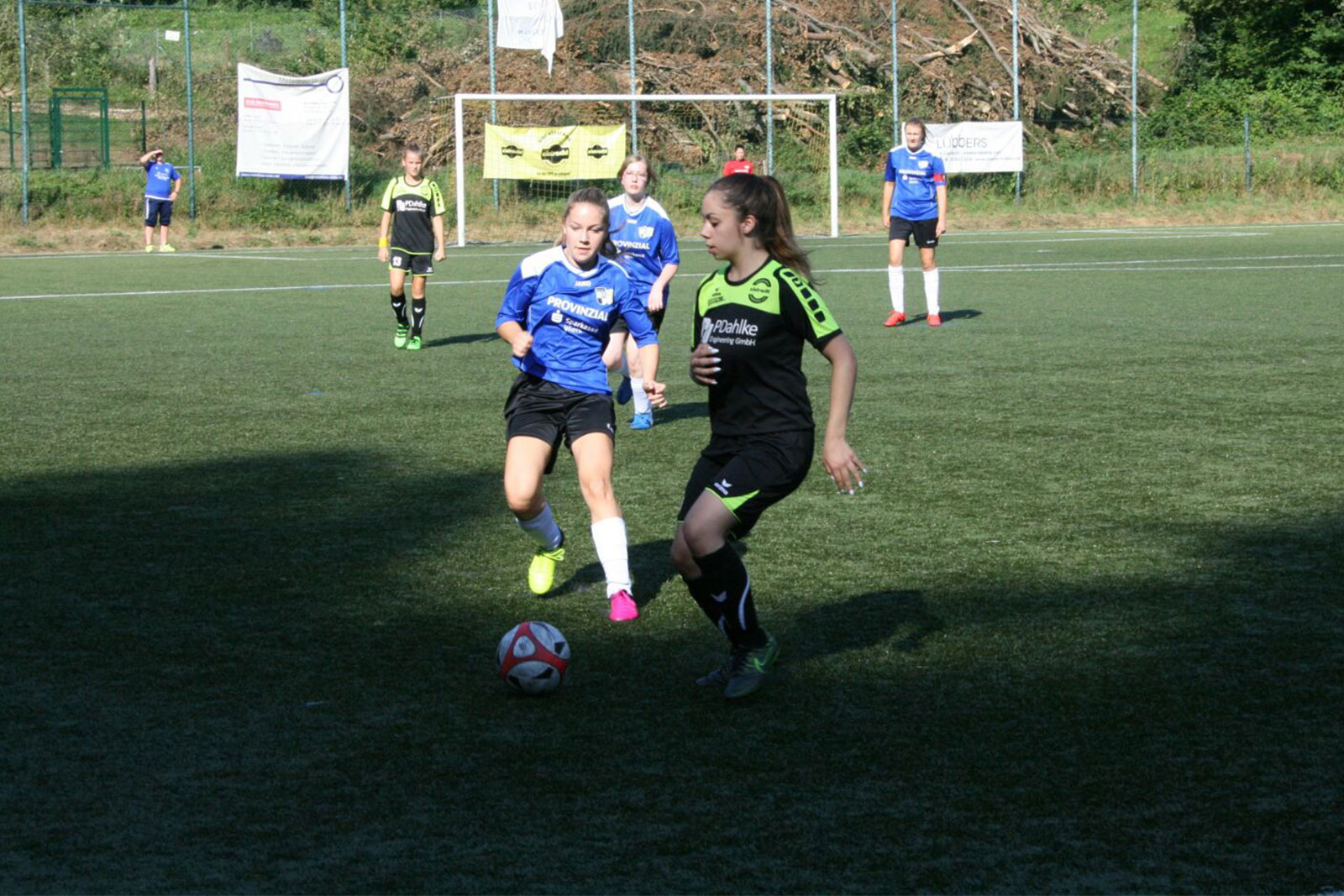 Der Start war sehr durchwachsen: unsere Mädels agierten erstmals in einem neuen System und kamen damit zu Beginn alles andere als gut klar. Die Mädchen hatten große Schwierigkeiten, ins Spiel zu finden. So gelang Hohkeppel nach einem Abwehrfehler die zu diesem Zeitpunkt nicht unverdiente 1:0 Führung. Erst kurz vor der Halbzeit zeigten unsere Mädchen, dass sie sich auch nach einigen Umstellungen gut präsentieren können. Nach einer schönen Kombination gelang Gina ein tödlicher Pass in die Tiefe, den Marika gekonnt verarbeitete und den Ball zum 1:1 Ausgleich ins Netz schob. Kurz darauf war Halbzeit.