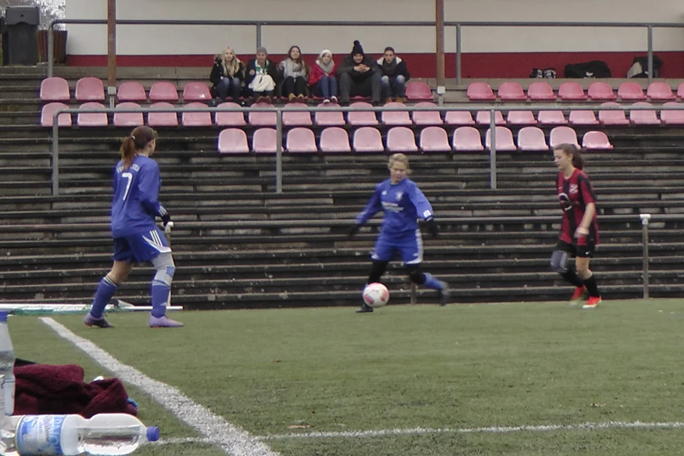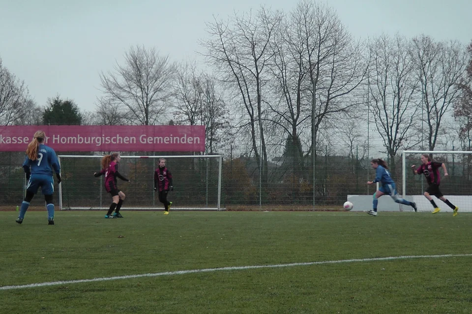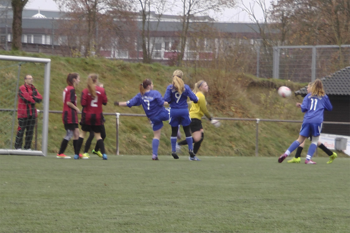 Bereits vor dem Spiel mussten die Trainer auf einige Spielerinnen verzichten, weshalb man am heutigen Tage insgesamt ein wenig umstellen musste. Trotz der Ausfälle erspielten sich unsere Mädchen von Anfang an zahlreiche gute Chancen und dominierten das Spiel nach Belieben. Zunächst scheiterte man noch an der gegnerischen Torhüterin oder am Aluminium. Dann aber erspielte man sich aus einer sehr starken Defensive heraus immer größere Gelegenheiten. Eine davon sollte schließlich passen, um in Führung zu gehen: Nach einem schönen Doppelpass zwischen Christin und Annalena scheiterte Christin zunächst an der Torhüterin, doch Annalena reagierte gut und schob den abprallenden Ball zum 1:0 ins Tor. Der Bann war gebrochen: nur kurze Zeit später erkämpfte sich Lara den Ball im Mittelfeld und spielte diesen die Linie entlang auf Annalena. Diese kontrollierte den Ball und schoss ihn zum 2:0 ins lange Eck. Kurz darauf war Halbzeit.