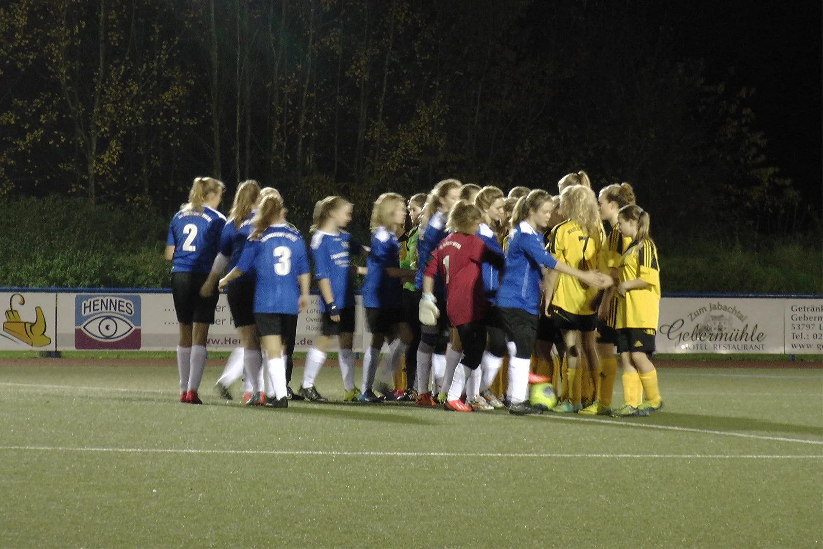 Nach einer komplizierten Hinfahrt hatten die Trainer nur wenig Zeit, die Mannschaft auf das Spiel einzustellen. Knappe Ansprachen scheinen der Mannschaft zu liegen, denn sie erwischte heute einen Blitzstart. Nachdem die gegnerische Torhüterin nach dem Herauslaufen einen Fehlpass in das Zentrum spielte, nahm sich die heutige Spielmacherin Gina ein Herz und schoss den Ball aus gut 25 Metern per Direktabnahme zur 1:0 Führung ins gegnerische Tor. In der Folge entwickelte sich ein temporeiches Spiel, in dem beide Mannschaften ein sehr gutes Umschaltverhalten zeigten. Dabei stand unsere Mannschaft im Defensivverbund wesentlich stärker als die Gastgeber und ließ kaum Chancen zu. Bei den eigenen Angriffsbemühungen fehlte es zunächst noch etwas an der Präzision, weshalb es mit der knappen 1:0 Führung in die Pause ging.
