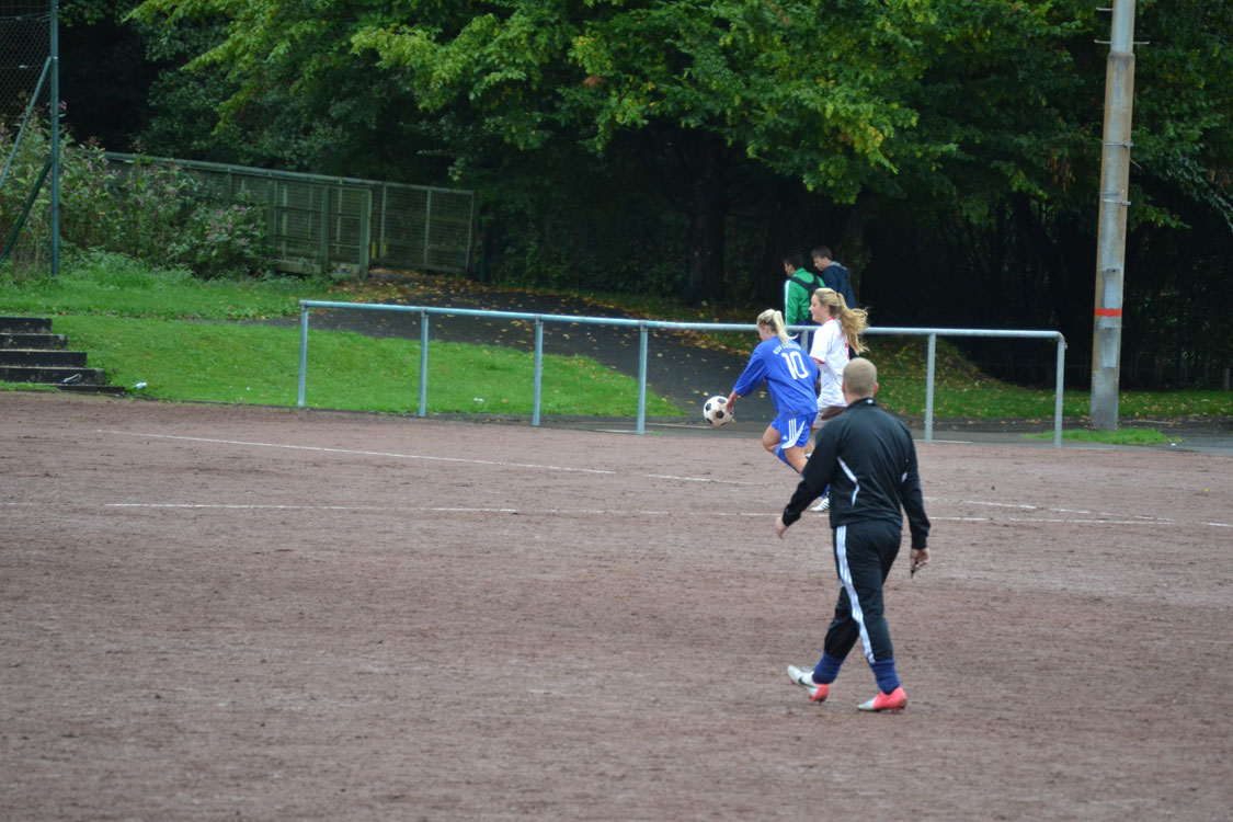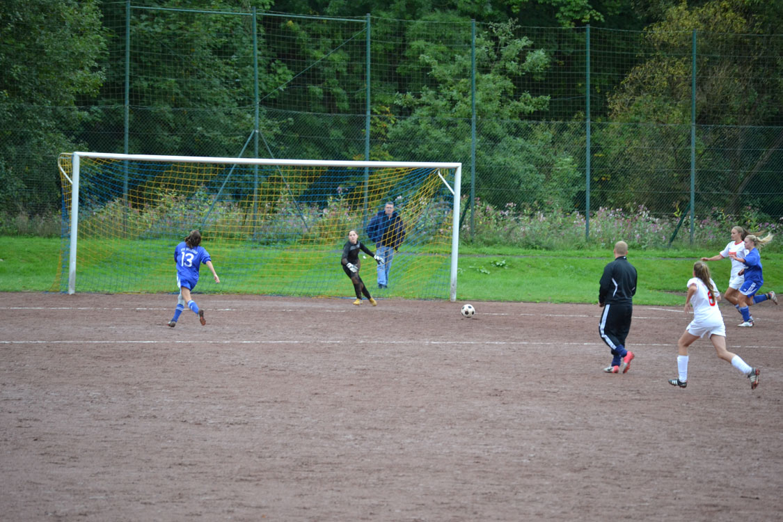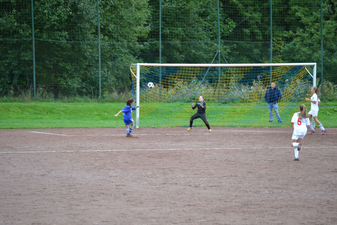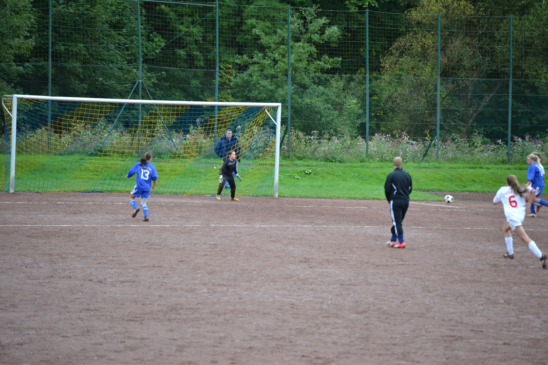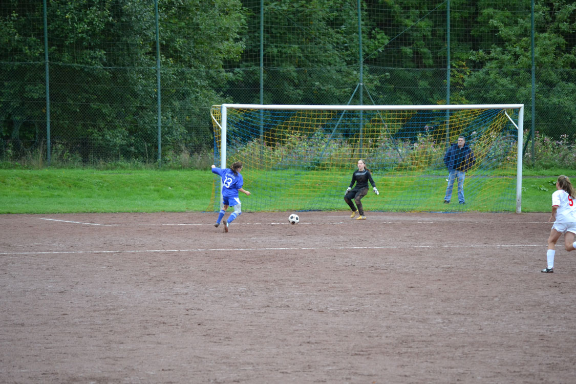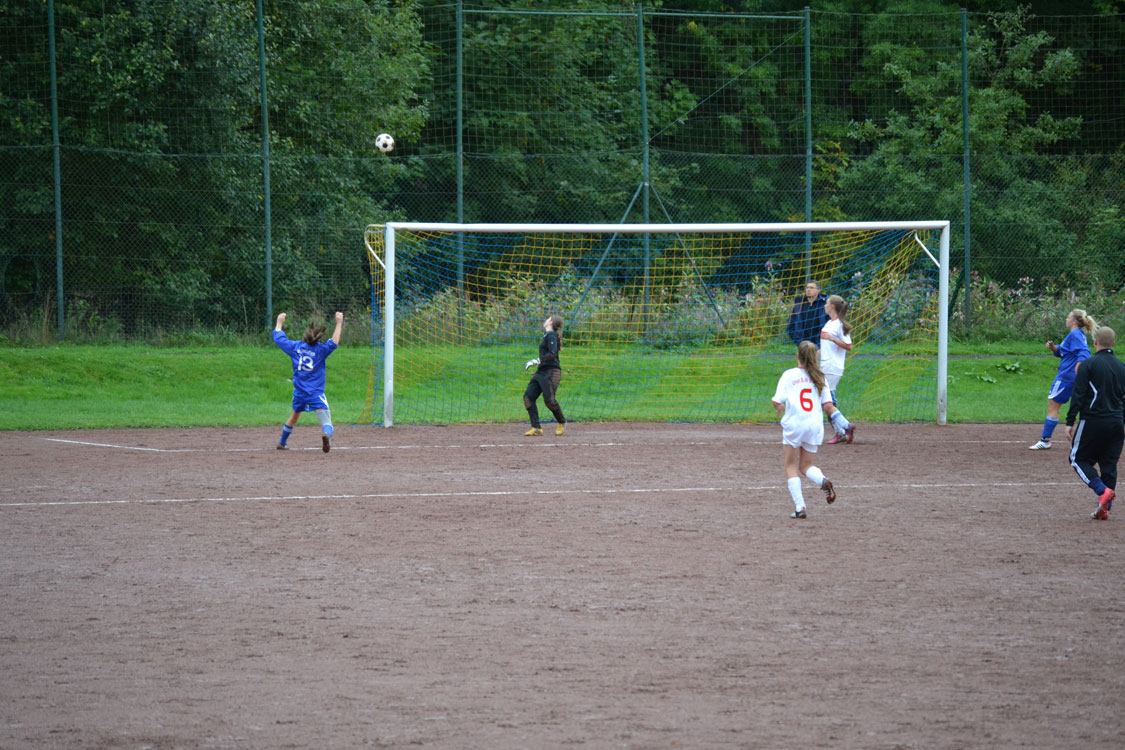 Leider begann das Spiel für unsere Mädchen denkbar schlecht: nachdem sich beide Mannschaften in den Anfangsminuten zunächst noch abtasteten, sorgte der erste Pfiff des jungen Schiedsrichters in der 8. Minute sofort für hitzige Diskussionen. Nach Meinung des Spielleiters war eine Biesfelder Spielerin im Strafraum regelwidrig gestoppt worden. Was wohl eine Fehlentscheidung war, mündete in einem Strafstoß, den die Schützin aus 15 Metern (so weit hatte der „Unparteiische“ den Ball nach hinten gelegt) mit viel Dusel einnetzen konnte. Die Mädchen lagen also 0:1 zurück, was sie aber fortan nicht daran hinderte, mit Willensstärke und Biss das Spiel an sich zu reißen und im weiteren Spielverlauf immer stärker zu werden. Flügelflitzerin Jenny war es schließlich vergönnt, das vollkommen verdiente (weil längst überfällige) 1:1 zu markieren. Obwohl Jenny danach noch eine weitere tausendprozenztige Chance hatte (s. Fotos), ging es mit diesem Ergebnis in die Pause.