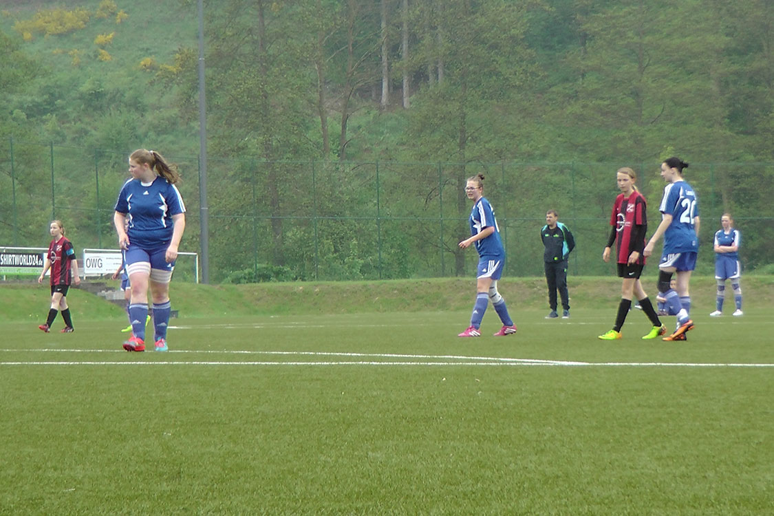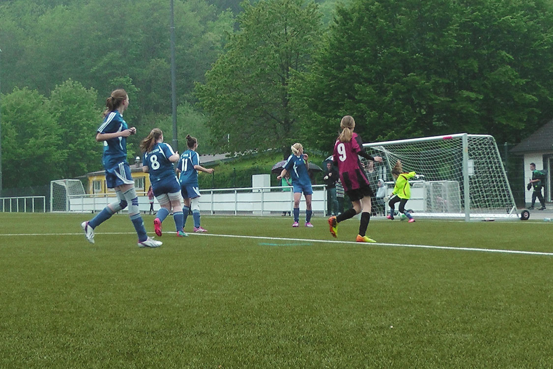 In der Halbzeitpause versuchte das Trainerteam, die Mannschaft aus dem Dornröschenschlaf zu wecken und forderte die Mädels auf, endlich wieder Fußball zu spielen. Die Ansprache zeigte ihre Wirkung: so merkte man relativ schnell, dass unsere Mädchen die erste Halbzeit vergessen machen wollten. Vor allem durch Kurzpassspiel versuchten die Mädchen dabei immer wieder, Sicherheit in das eigene Spiel zu bringen. Das gelang: Nach kurzem Abtasten kombinierte sich unser Sturmduo Christin Siegmund / Annalena Müllenmeister durch die komplette gegnerische Abwehrreihe hindurch und konnte in Person von Annalena den Ball schließlich zur 2:1 Führung im Tor unterbringen. Das Tor tat den Mädchen gut, die nun auch defensiv wieder deutlich besser standen und kaum noch eigene Torchancen zuließen. So war es letztlich erneut Annalena vorbehalten, die Zuschauer mit ihren Toren zu unterhalten. Nachdem Annalena zunächst einen Querpass in der gegnerischen Abwehr abfing, machte sie sich schließlich auf den Weg. Frei vor dem Tor hatte Annalena keine Mühe, den Ball zum 3:1 in die Maschen zu schieben. Das Tor nagte an der Ehre der Gäste, die nun wieder etwas offensiver agierten. So kamen die Gäste nach einem Abschlag unser Torhüterin Eugenie Sawinkin nochmals zu einer richtig guten Torchance. Eugenie vereitelte diese aber selber, in dem sie einen Sprint anzog und mit einem Hechtsprung den Ball von der Linie kratzte. Der Schlusspunkt war schließlich Vanessa Heinrich vorbehalten: nachdem sich Annalena zunächst gut über außen durchsetzen konnte, spielte sie einen klugen Pass in den Rücken der Abwehr. Dort stand Vanessa, die den Ball per Direktabnahme verwertete und mit einer super Schusshaltung ins lange obere Eck zum 4:1 Endstand bugsierte.