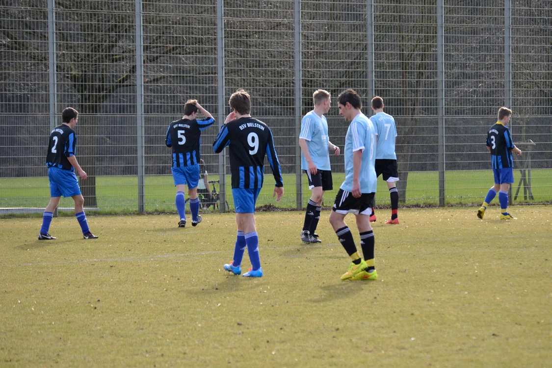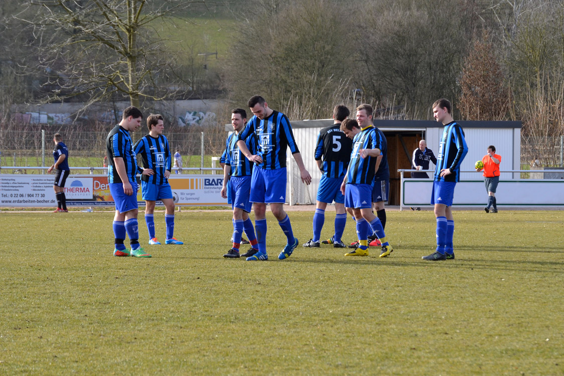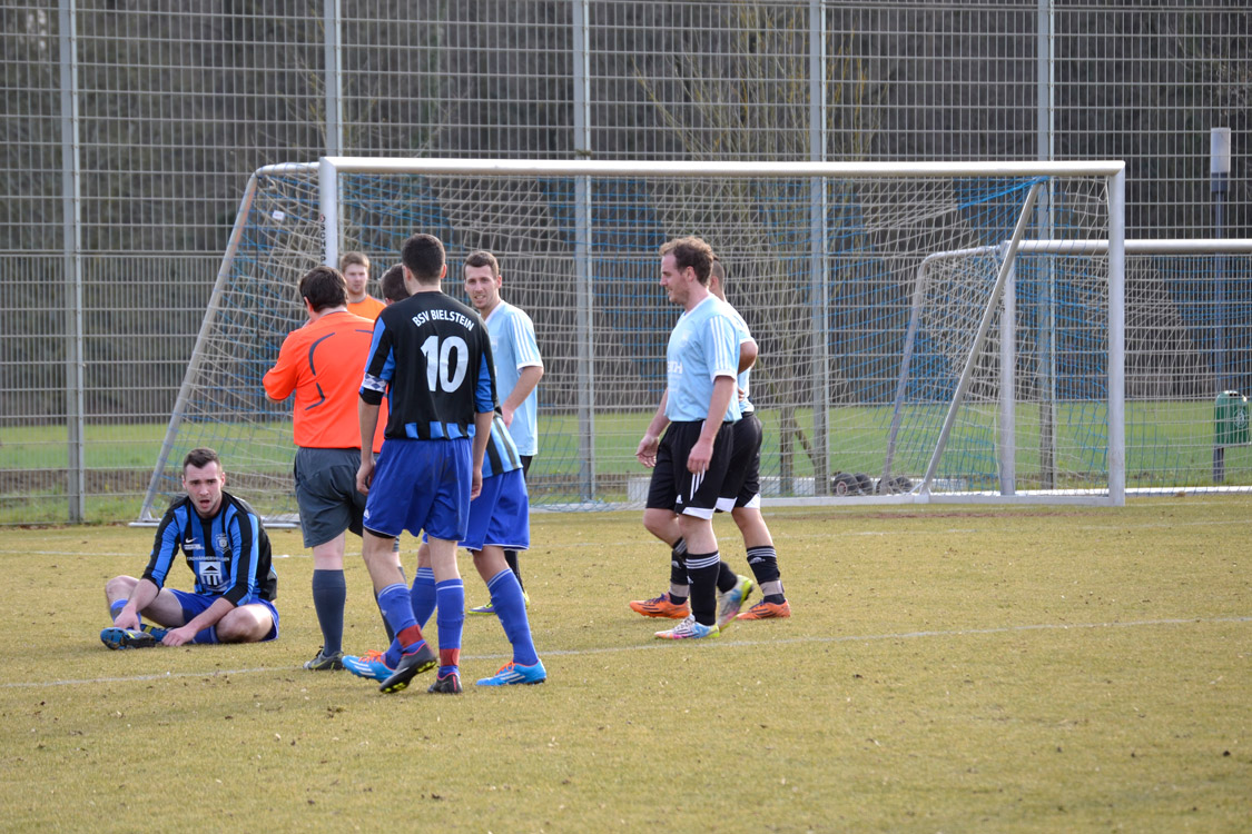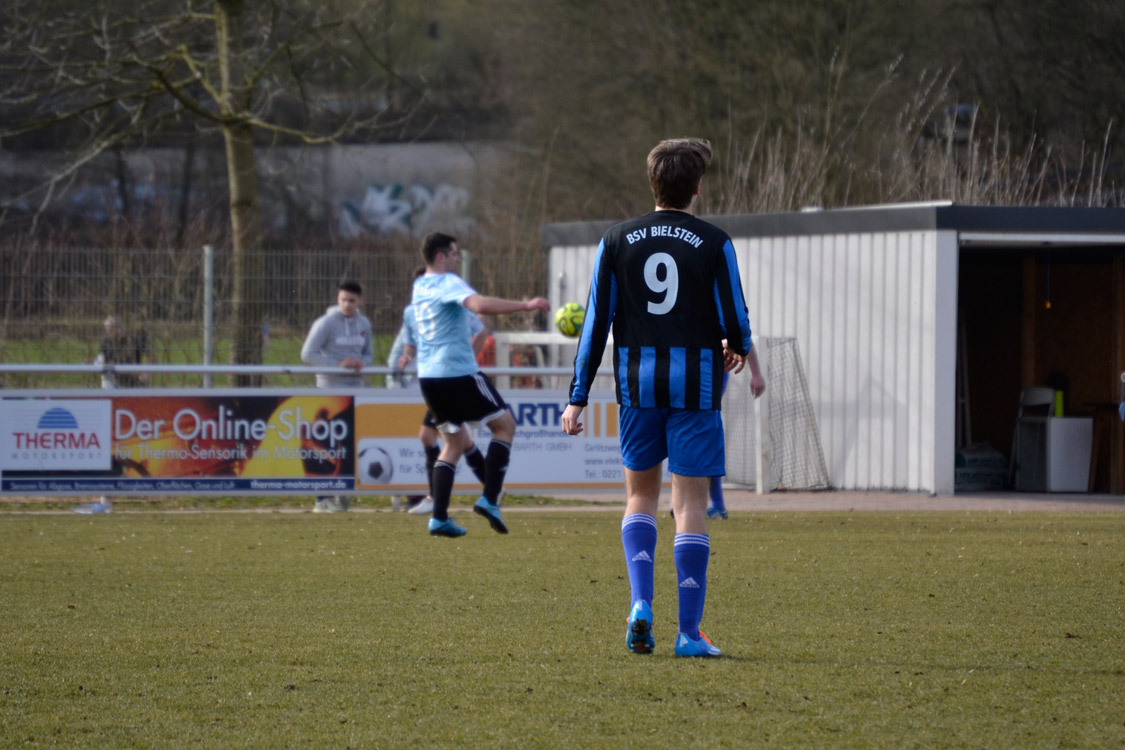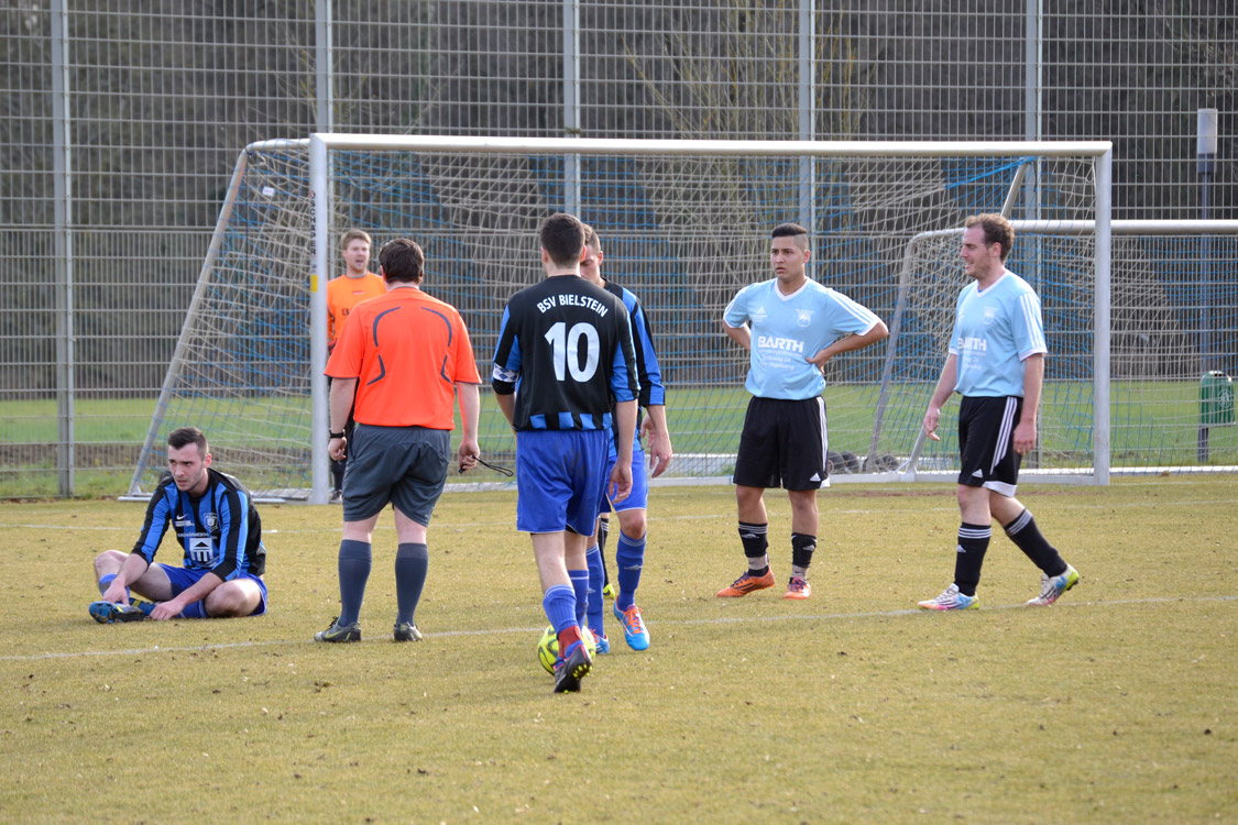 Durch die Witterung und auch durch die Einstellungen einiger Akteure fiel die Vorbereitung leider sehr dürftig aus. So war klar, dass konditionell noch Luft nach oben ist. Die Trainer simmten das Team schließlich auch auf ein schweres Spiel ein. Der relativ weiche Rasen und das konsequente Verschieben in der Defensive kostete die Zentrale des BSV Bielstein tatsächlich ziemlich viel Kraft. Dennoch wurde das intensive Verschieben über die komplette Spieldauer durchgezogen. Dabei stand die Defensive sehr gut und die beiden Viererketten sehr eng gestaffelt. Die Gastgeber versuchten, die wenigen Räume, die sich ihnen boten, spielerisch zu überbrücken, bissen sich aber immer wieder die Zähne am Defensivverbund der Bielsteiner aus und kamen im ersten Durchgang nur zu ein bis zwei Möglichkeiten, die allesamt durch den Keeper Jan Böhl pariert werden konnten. Die beste Möglichkeit der ersten Hälfte ergab sich jedoch für den BSV: Nach einer Ecke von Markus Gehle konnten die Gastgeber zunächst klären. Der Ball landete aber direkt vor den Füßen von Marcus Findeisen, der aus der Distanz den Abschluss suchte. Dieser wurde abgefälscht und landete bei Konstatin Nickel, der den Ball quer zu Martin Hense spielte. Der Abschluss vom Fünfmeterraum wurde jedoch in letzter Sekunde von einem gegnerischen Spieler geklärt.